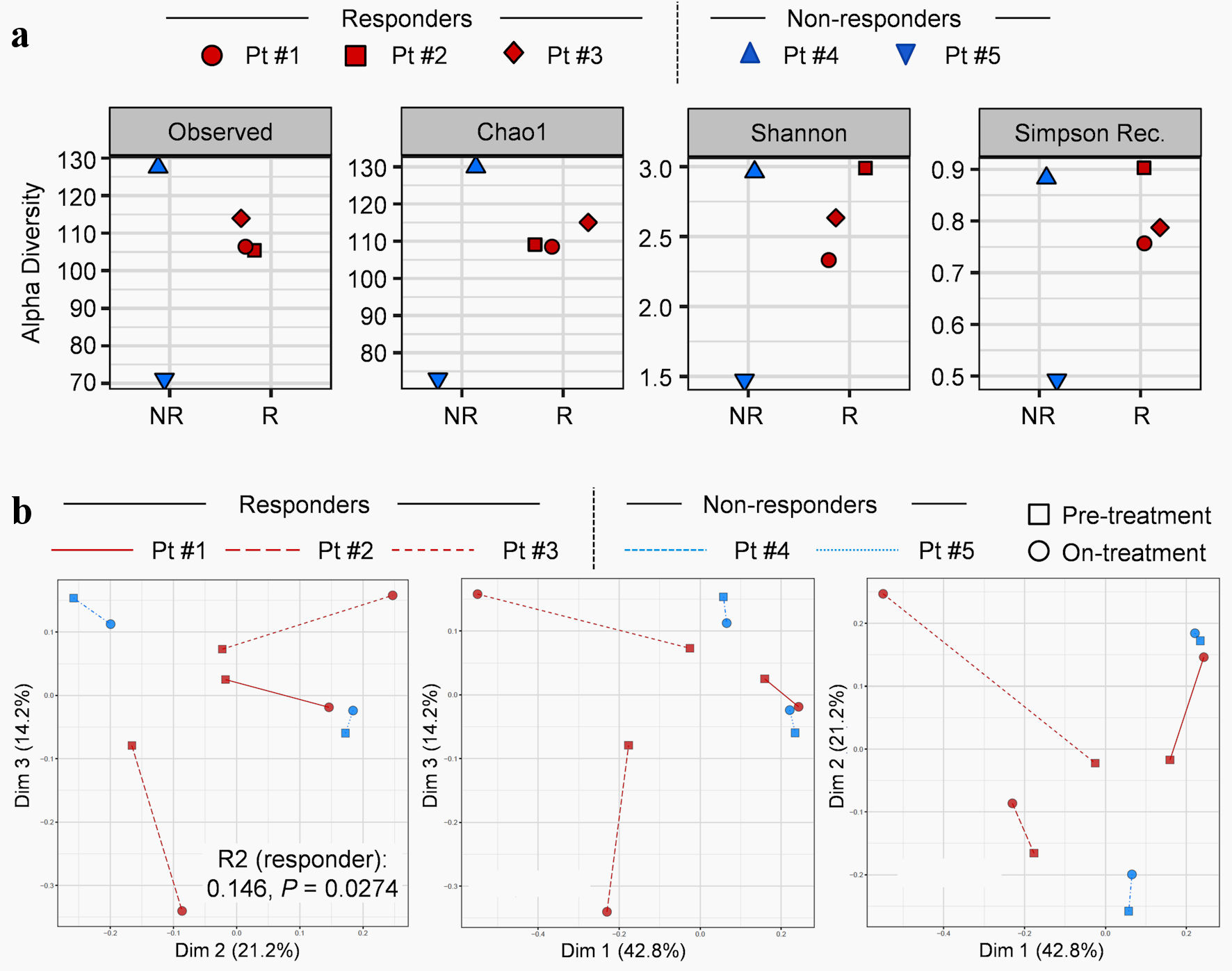 Conclusions: This pilot study identified a substantial change in gut microbiome diversity between pre- and on-treatment samples in NSCLC patients responding to anti-PD-1 therapy compared to non-responders. Our findings highlight the potential utility of gut microbiota dynamics as a noninvasive biomarker to predict response to PD-1/PD-L1 blockade therapy for a wide variety of malignancies, which sets a path for future investigation in larger prospective studies.