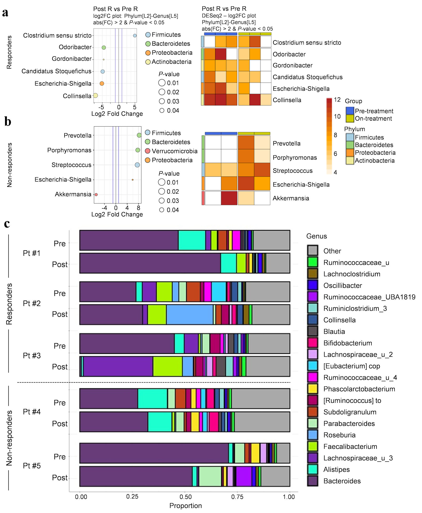 We next assessed microbial composition in responders (Fig. 3a) and non-responders (Fig. 3b). Overall change in genus composition for each subject is depicted in Figure 3c. Responders demonstrated statistically significant post-treatment decreases in the abundance of genera Odoribacter, Gordonibacter, Candidatus stoquefichus, Escherichia-Shigella, and Collinsella, and increase in abundance of Clostridium sensu stricto 1 (Fig. 3a, c). In contrast, non-responders demonstrated statistically significant post-treatment increases in genera Prevotella, Porphyromonas, Streptococcus, and Escherichia-Shigella, and decrease in abundance of Akkermansia (P < 0.05) (Fig. 3b, c). These findings suggest that on-treatment change in microbial profiles was different between responders and non-responders.