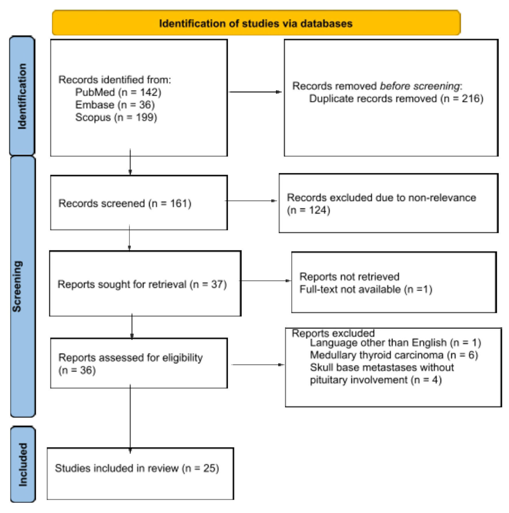 The Preferred Reporting Item for Systematic Review and Meta-Analysis (PRISMA) guidelines were followed in this systematic review [13]. Three electronic databases (PubMed, Embase, and Scopus) were comprehensively searched for articles on DTC and PM published until August 2022. The search was done using the following subject headings: papillary thyroid cancer, follicular thyroid cancer, Hurthle cell thyroid cancer, differentiated thyroid cancer, and pituitary metastasis. No specific search filters were applied. References were uploaded to Zotero v5.0.81 (Zotero.org). This reference manager automatically identified duplicate articles, which were removed. The remaining list of references was manually and carefully checked by two authors (NPI and JC) to ensure that all duplicate articles had been removed.