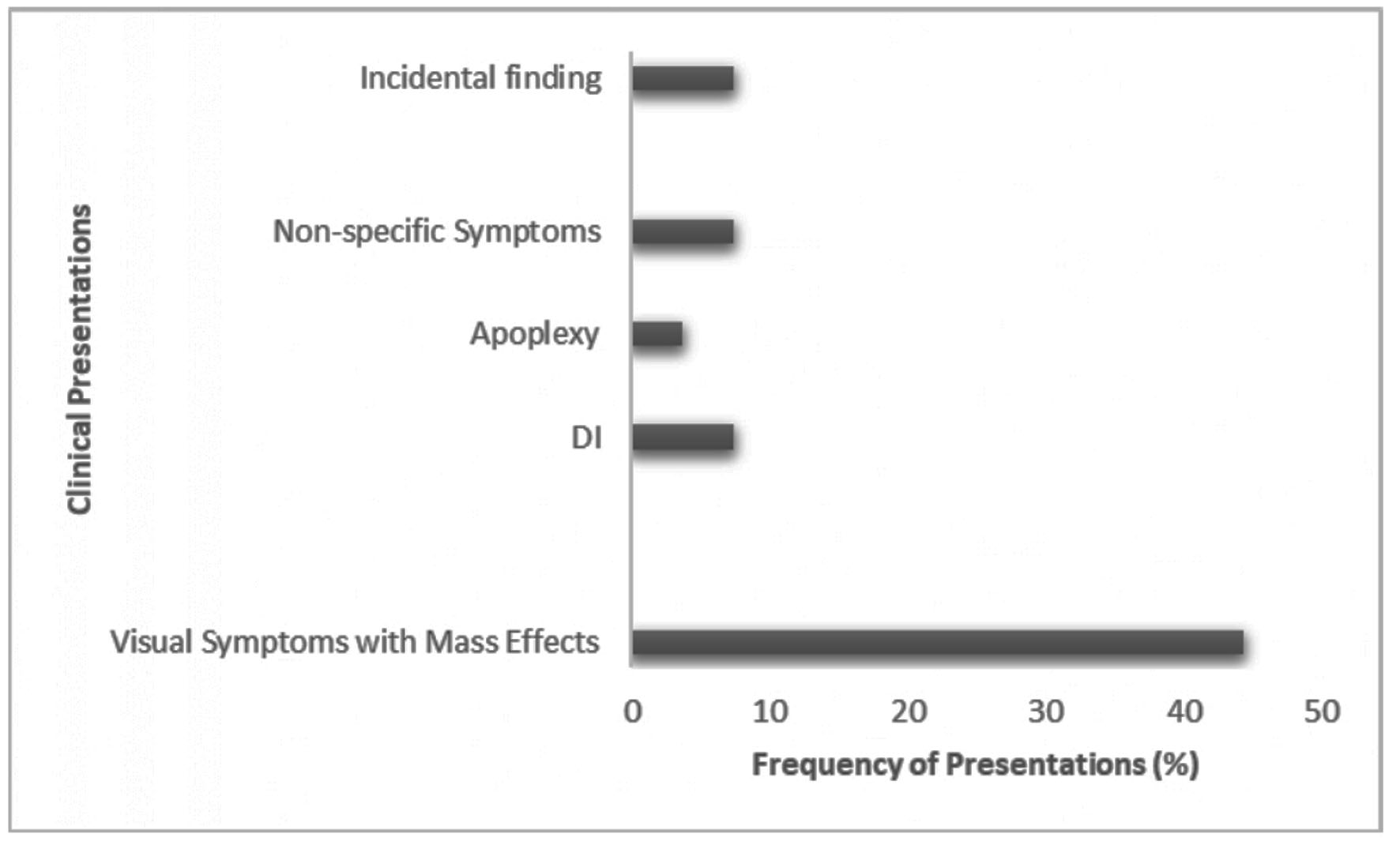 ![]() Click for large image | Figure 2. Frequency of presenting symptoms in PM from DTC. DI: diabetes insipidus; PM: pituitary metastasis; DTC: differentiated thyroid cancer. |