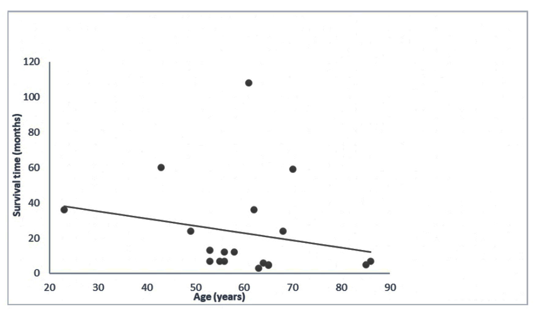 The treatment modalities for PM are shown in Table 3 [5, 9, 10, 15-36]. The overall median survival (follow-up) time was 12 months (3 - 108) from 18 studies (n = 20) which reported the survival (follow-up) time [5, 9, 10, 15, 18, 20, 23-29, 31-35]. At the end of the follow-up, 70% (n = 14) of the patients were still alive [5, 9, 10, 15, 24-28, 31-33, 35], while 30% of them (n = 6) were deceased [18, 19, 23, 24, 29, 34]. Eleven studies [5, 9, 10, 15, 17-19, 24, 26, 28, 30] reported the clinical status of the symptoms of the patients at the end of the follow-up; only 33.3% (n = 4) achieved complete resolution from symptoms while 66.7% (n = 8) still had some residual symptoms. As shown in Supplementary Material 3 (www.wjon.org), there was a moderate inverse correlation between the age of patients and survival, which was, however, not statistically significant (rs = -0.44806, P = 0.103).