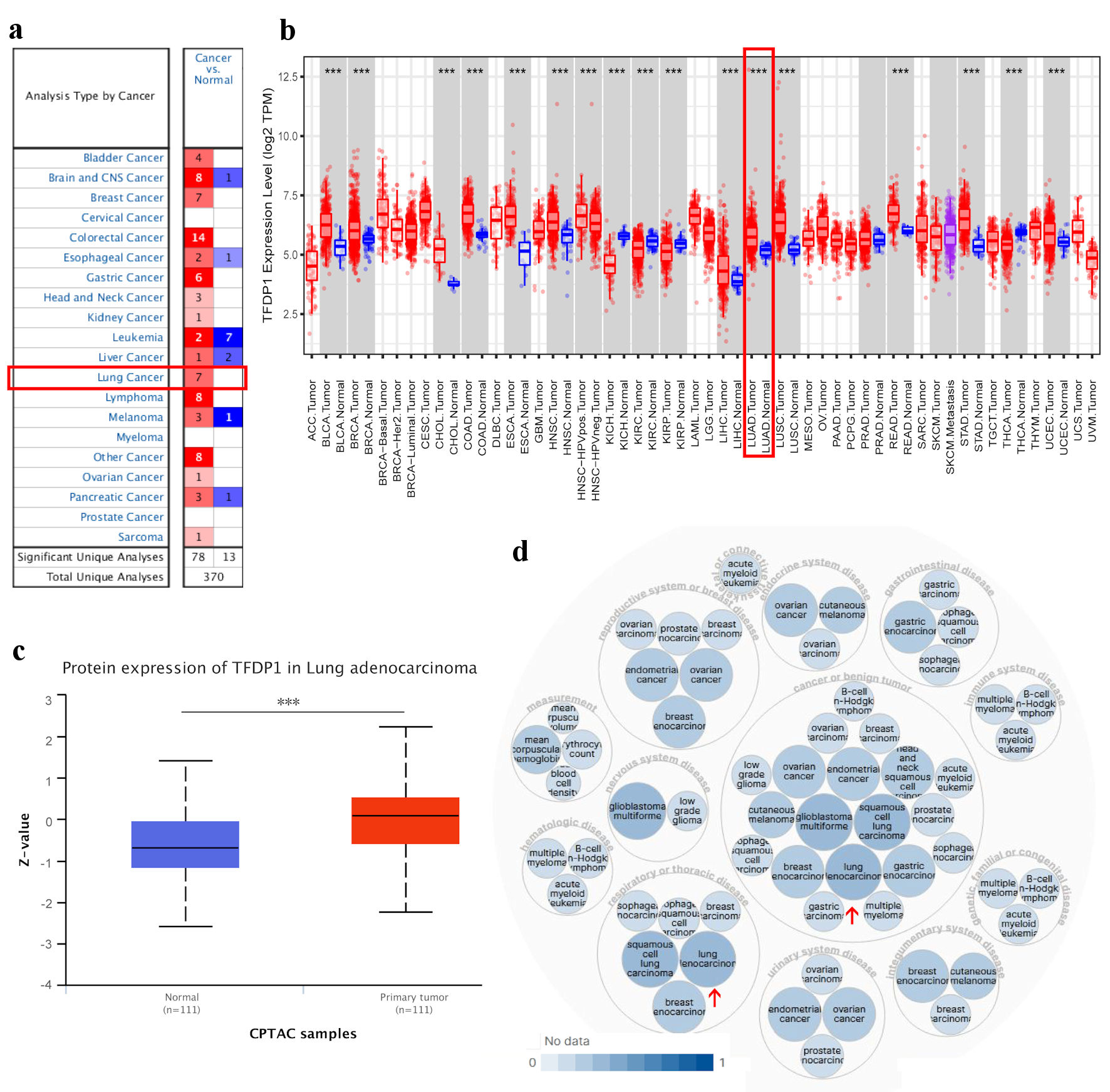 Then, we tried to analyze TFDP1 protein expression levels using the CPTAC database with UALCAN. Compared with normal tissues, the protein expression levels of TFDP1 were significantly upregulated in LUAD tissues (Fig. 1c). In addition, using the Open Targets Platform, we also found that TFDP1 was associated with respiratory (e.g., LUAD), thoracic, reproductive system, breast, gastrointestinal, immune system, and endocrine system diseases (Fig. 1d). These findings revealed that the TFDP1 transcriptional levels were markedly overexpressed in LUAD.
