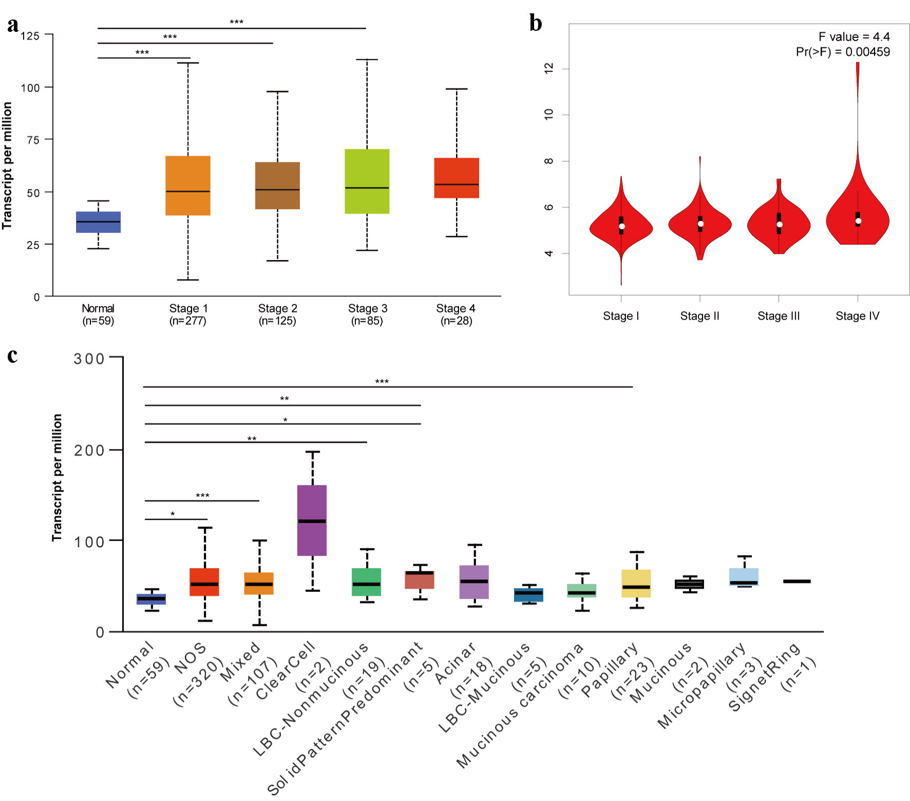 ![]() Click for large image | Figure 2. Relationship of TFDP1 with the pathological stages of LUAD patients analyzed by UALCAN (a) and GEPIA 2 (b). (c) TFDP1 expression differences in the LUAD histological subtypes. (*P < 0.05, **P < 0.01, ***P < 0.001). TFDP1: transcription factor Dp-1; LUAD: lung adenocarcinoma. |