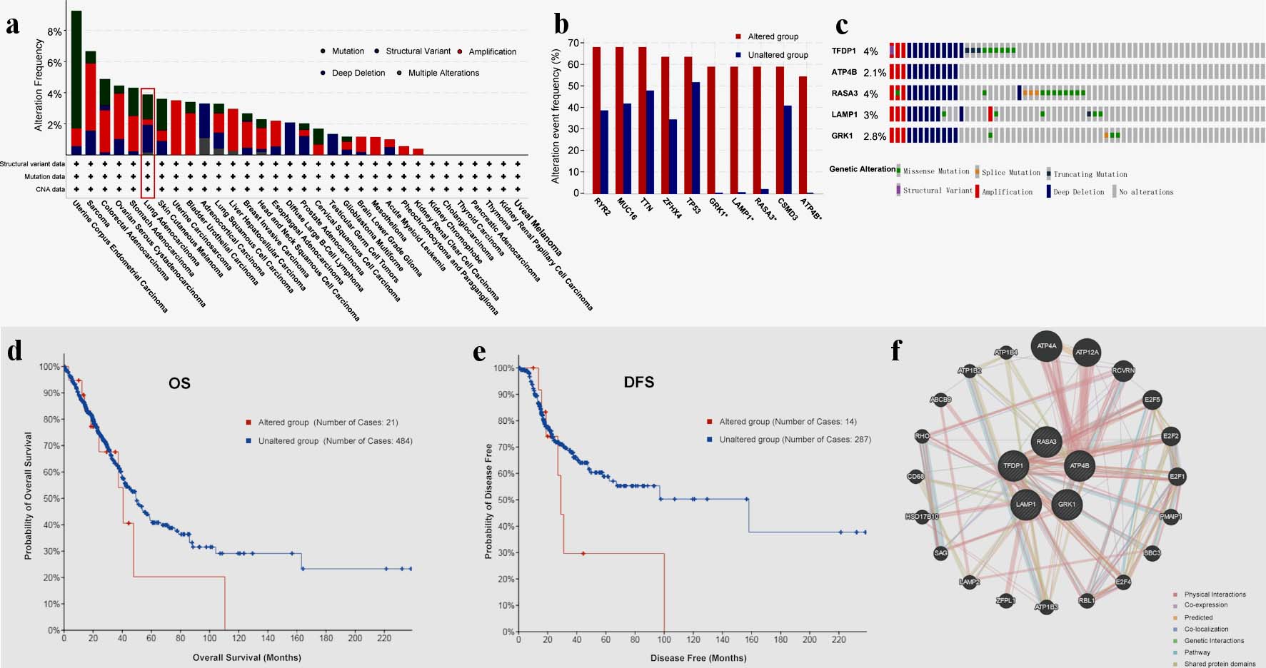 We demonstrated that the 10 genes with the highest alteration frequencies in the LUAD altered groups were RYR2, MUC16, TTN, ZFHX4, TP53, GRK1, LAMP1, RASA3, CSMD3, and ATP4B, cooccurred with TFDP1 modifications (Fig. 4b). Additionally, we found that TFDP1 alterations cooccurred with GRK1, LAMP1, RASA3, and ATP4B (log ratio > 4). Also, GeneMANIA was employed to create a gene-gene interaction network of the five genes (Fig. 4c). Compared with LUAD patients without TFDP1 alteration, TFDP1-altered patients might have a poor OS (Fig. 4d) and disease-free survival (DFS) values (Fig. 4e).