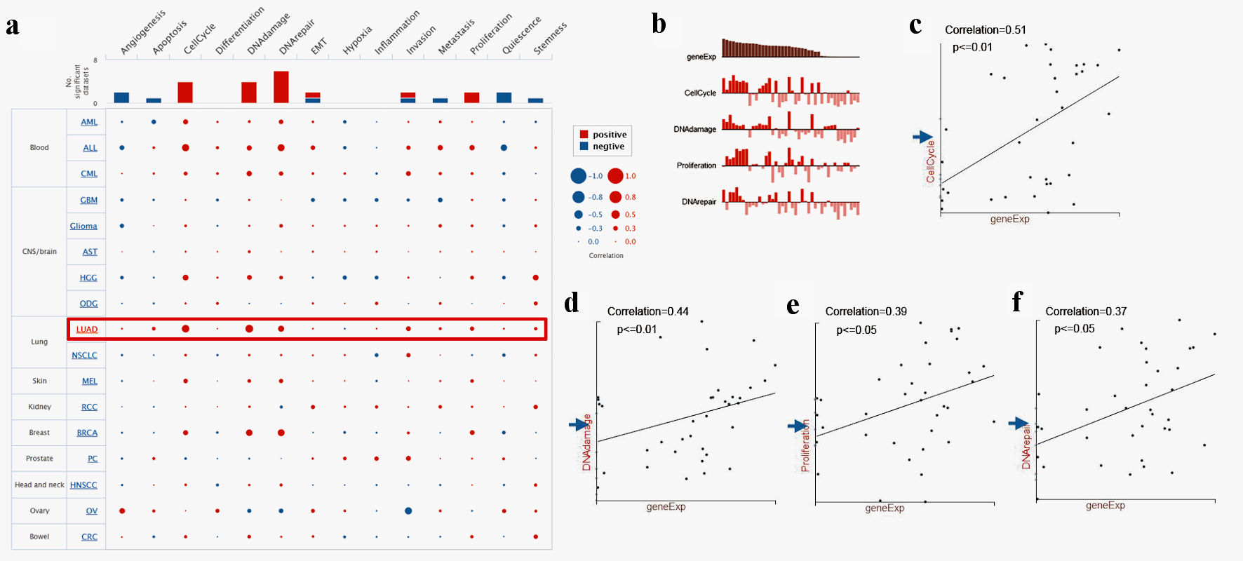 CancerSEA [37] can comprehensively decode 14 functions from 41,900 single cells spanning 25 different cancers at the single-cell resolution [38]. We used CancerSEA to find which functional states of TFDP1 were related to LUAD.