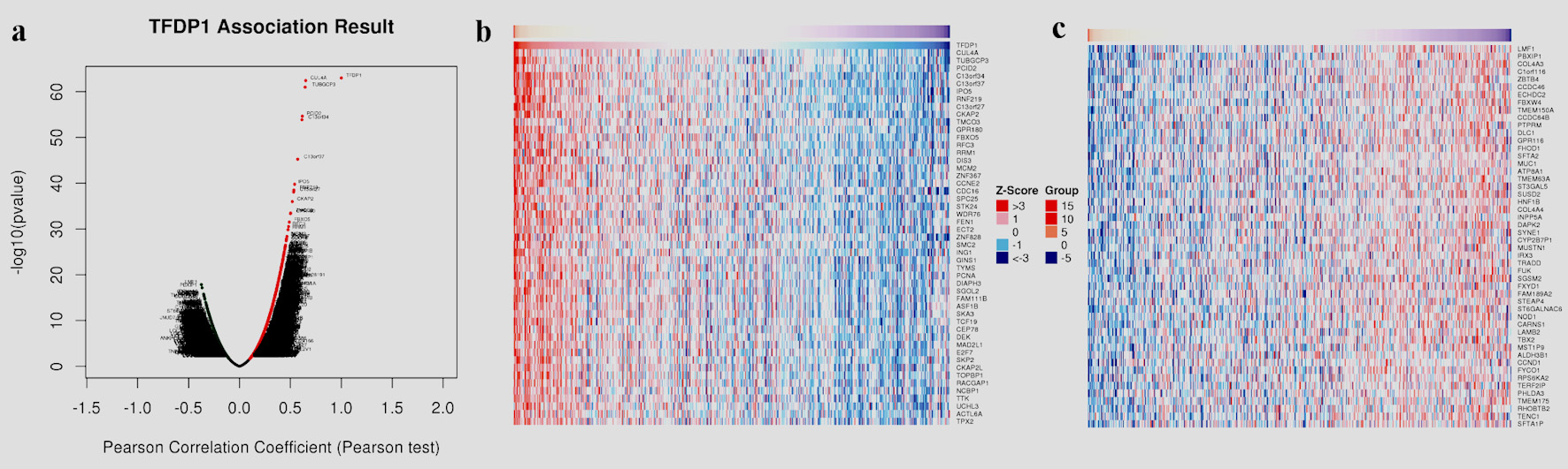 ![]() ![]() ![]() Click for large image | Figure 7. TFDP1 coexpressed genes in LUAD (LinkedOmics). (a) The volcano plot shows the TFDP1-related significantly coexpressed genes (Pearson test) in LUAD. (b) The heat map shows the top 50 positively TFDP1-correlated genes. (c) The heat map shows the top 50 negatively TFDP1-correlated genes. (d) Survival maps show the top 50 genes positively and negatively related to TFDP1, respectively. (e) Correlations between the top five positively TFDP1-correlated genes and TFDP1. (f) Correlations between the top five negatively TFDP1-correlated genes and TFDP1. TFDP1: transcription factor Dp-1; LUAD: lung adenocarcinoma. |