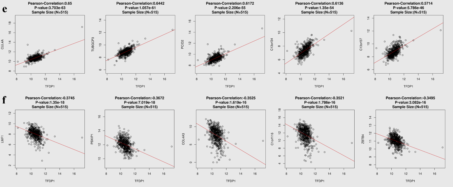 To understand the genes related to TFDP1 and the mechanisms of TFDP1, LinkedOmics was employed to study TFDP1 mRNA sequencing data in 515 LUAD patients from the TCGA cohort. Figure 7a showed that 2,946 genes (dark red dots) were positively related to TFDP1, and 2,553 genes (dark green dots) were negatively related to TFDP1 in LUAD (FDR < 0.01). The top 50 positively TFDP1-correlated genes were demonstrated with heat maps in red (Fig. 7b) and the 50 negative genes in blue (Fig. 7c). Interestingly, survival maps of most positively and negatively TFDP1-correlated genes displayed high and low HRs, respectively (Fig. 7d). Moreover, TFDP1 expression was most positively correlated with CUL4A (positive rank# 1, Pearson correlation = 0.65, P = 3.703 × 10-63), TUBGCP3 (correlation = 0.6442, P = 1.057 × 10-61), PCID2 (correlation = 0.6172, P = 2.206 × 10-55), C13orf34 (correlation = 0.6136, P = 1.35 × 10-54), and C13orf37 (correlation = 0.5714, P = 5.786 × 10-46) (Fig. 7e), whereas TFDP1 was most negatively correlated with LMF1 (negative rank #1, correlation = -0.3745, P = 1.35 × 10-18), PBXIP1 (correlation = -0.3672, P = 7.019 × 10-18), COL4A3 (correlation = -0.3525, P = 1.62 × 10-16), C1orf116 (correlation = -0.3521, P = 1.79 × 10-16), and ZBTB4 (correlation = -0.3495, P = 3.08 × 10-16) (Fig. 7f).