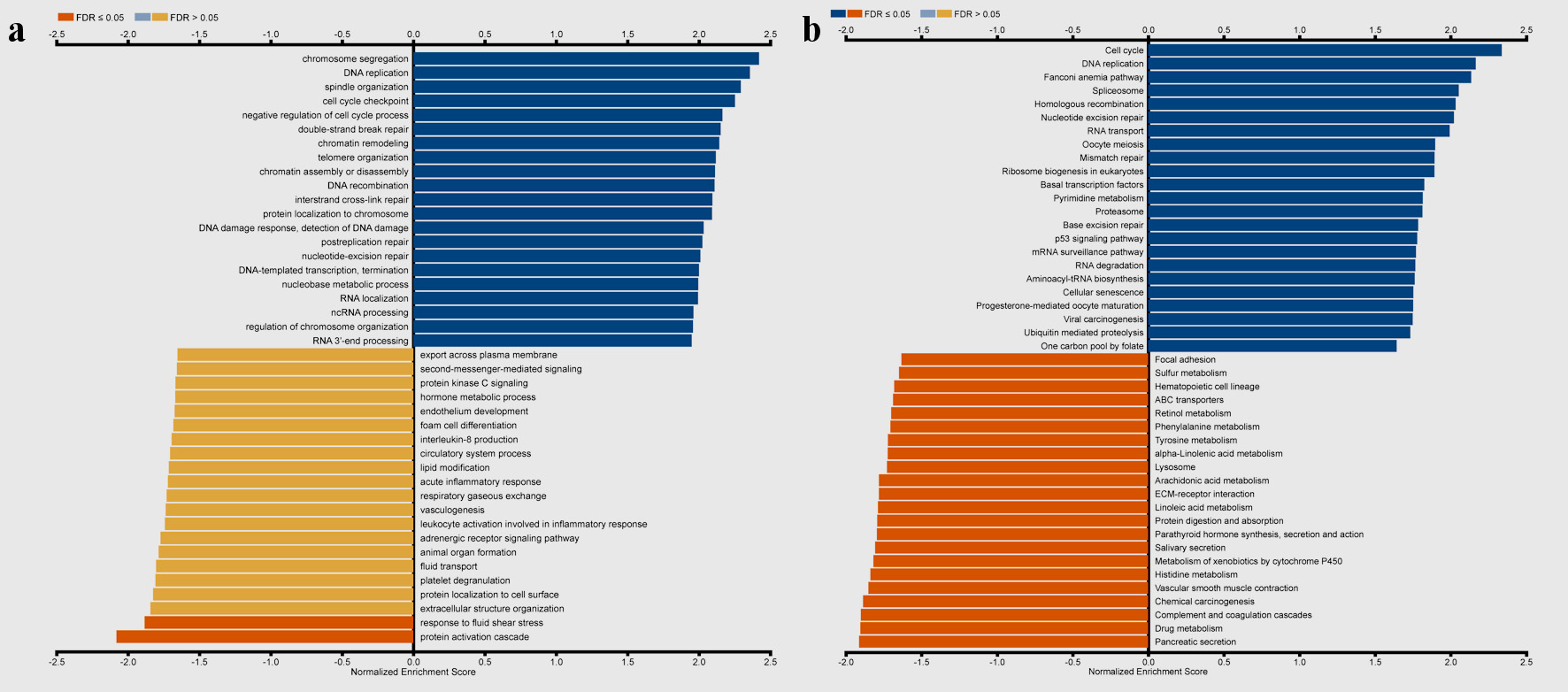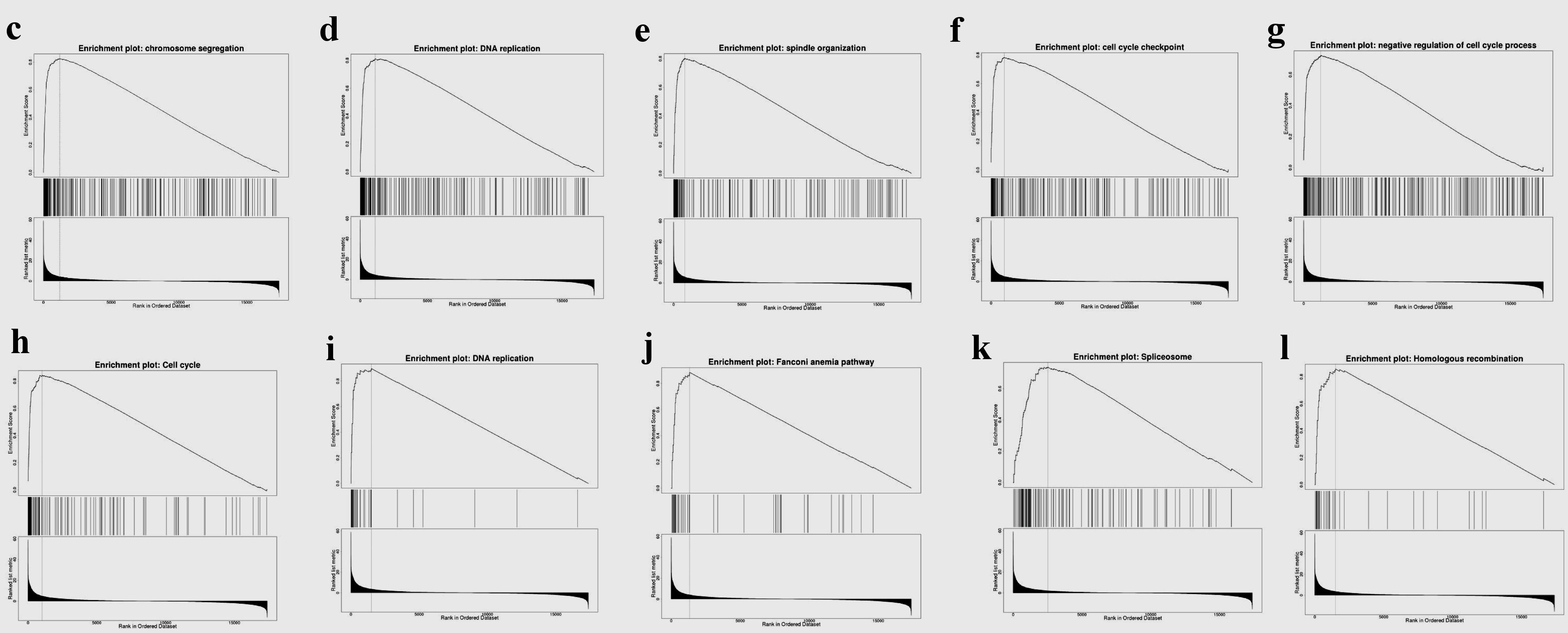 As shown in Figure 8, GO results of GSEA revealed that genes coexpressed with TFDP1 were mainly involved in the clusters related to cell proliferation, including chromosome segregation (Fig. 8c), DNA replication (Fig. 8d), spindle organization (Fig. 8e), cell cycle checkpoint (Fig. 8f), chromatin remodeling, telomere organization, and DNA recombination. KEGG pathway results also displayed that these genes were primarily enriched in cell proliferation, for example, cell cycle (Fig. 8h), DNA replication (Fig. 8i), spliceosome (Fig. 8k), homologous recombination (Fig. 8l), and nucleotide excision repair.