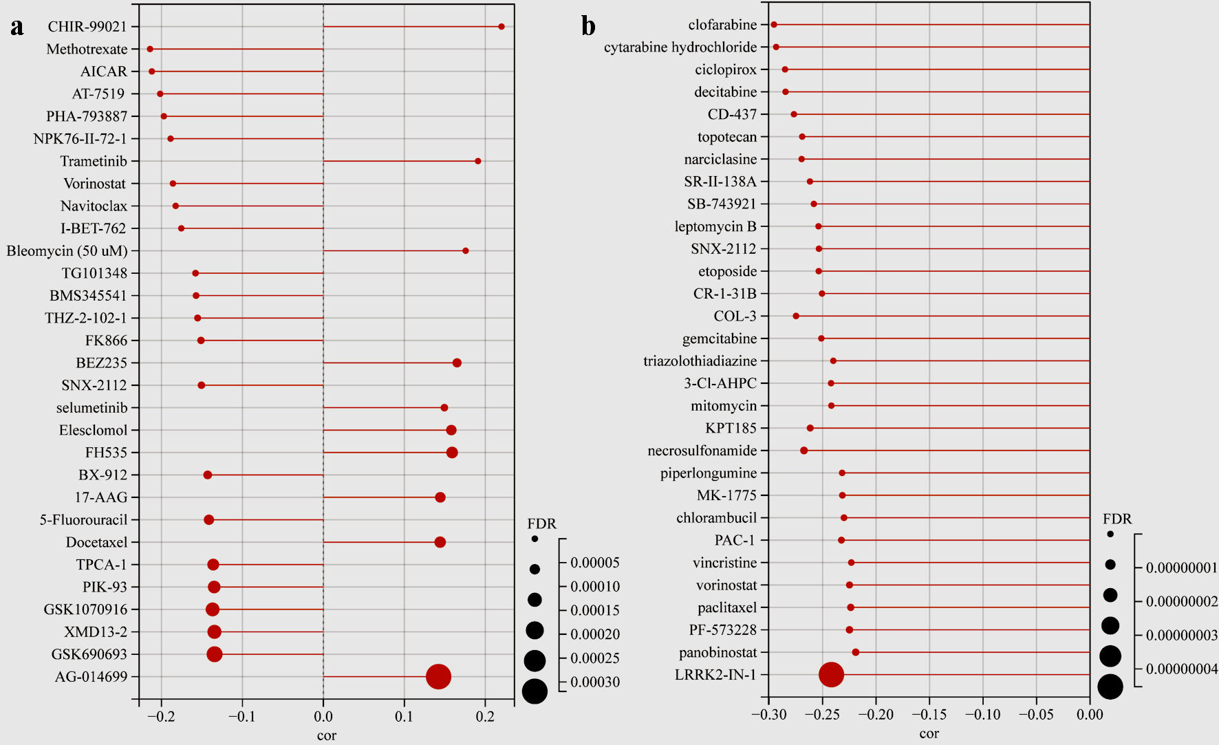 GSCA [41] was employed to examine the association between TFDP1 expression and drug sensitivity in the Cancer Therapeutics Response Portal (CTRP) and Genomics of Drug Sensitivity in Cancer (GDSC) databases [42]. The scores of the TFDP1-drug pairs were calculated by -log10FDR * |cor|, with the absolute correlation coefficient |cor| > 0.1 and FDR < 0.05. The top 30 ranked drugs were demonstrated by the lollipop plot.