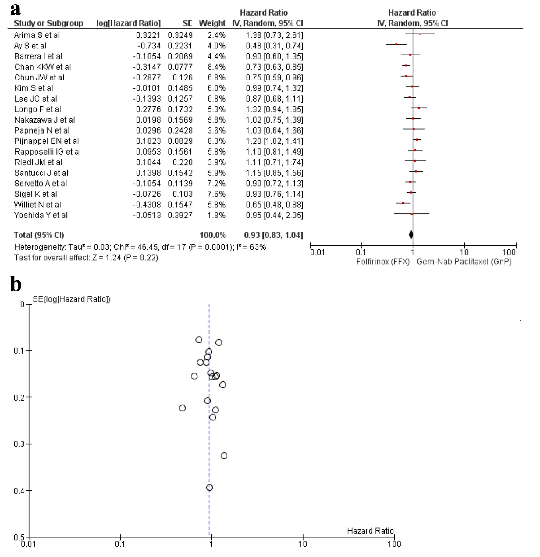 A total of 18 studies [16-33] reported OS out of the 21 relevant studies. There was no statistical difference found in between the usage of FFX and GnP as first-line treatment to increase the OS time (HR: 0.93, 95% CI: 0.83 - 1.04; P = 0.0001) (Fig. 2a, b). Sensitivity analysis was conducted and studies with different guidelines were removed, although no significant difference was observed in the results (HR: 0.91; 95% CI: 0.81 - 1.01; P = 0.005) (Supplementary Material 6, www.wjon.org).