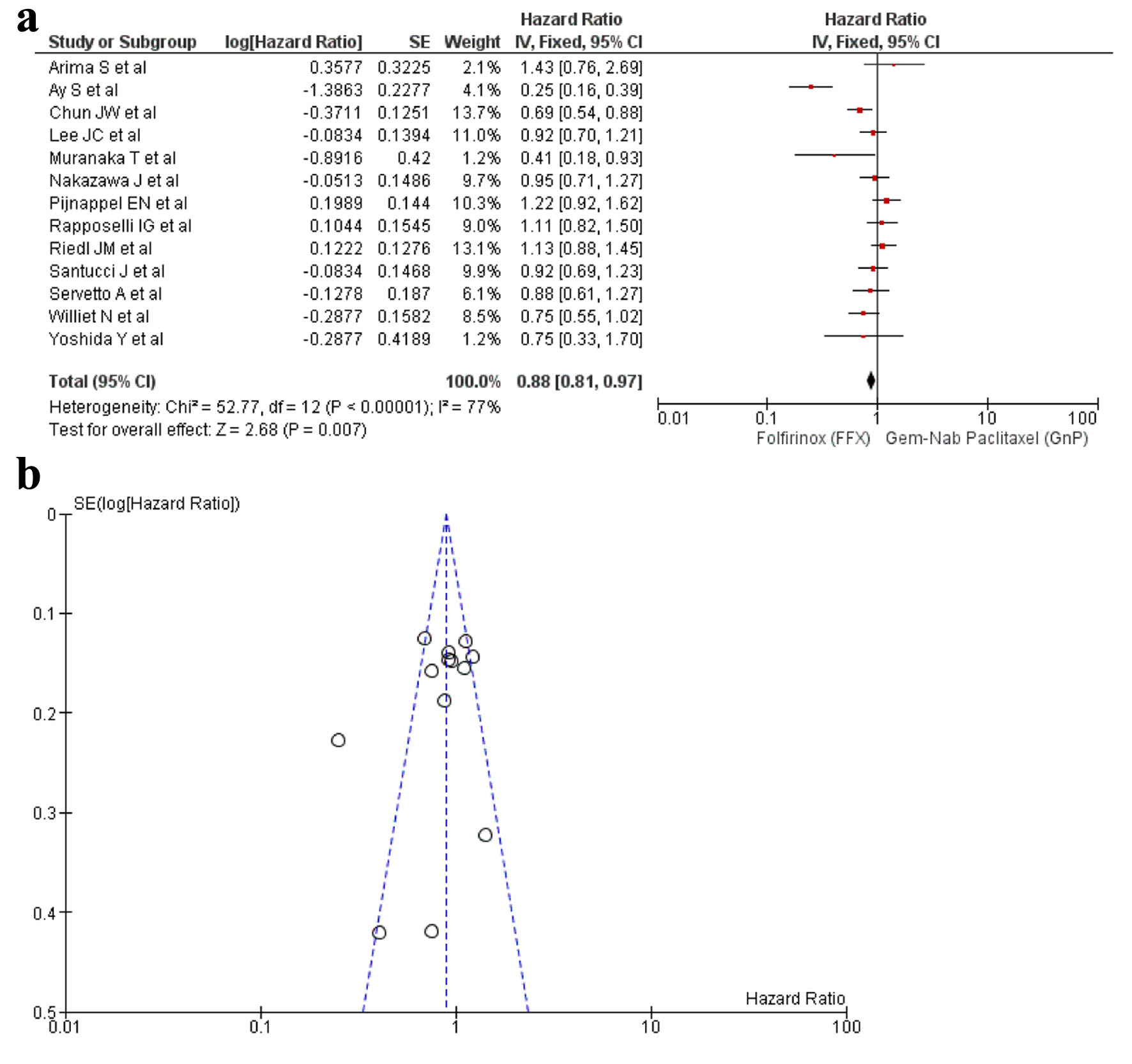 A total of 13 studies [16-22, 24, 25, 27, 29, 32, 34] reported PFS and a significant difference was observed between the use of FFX and GnP as the first-line treatment for PC (HR: 0.88, 95% CI: 0.81 - 0.97; P < 0.0001) (Fig. 3a, b). Sensitivity analysis was conducted and removal of studies yielded a non-significant result (HR: 0.93, 95% CI: 0.85 - 1.02; P = 0.04) (Supplementary Material 7, www.wjon.org).