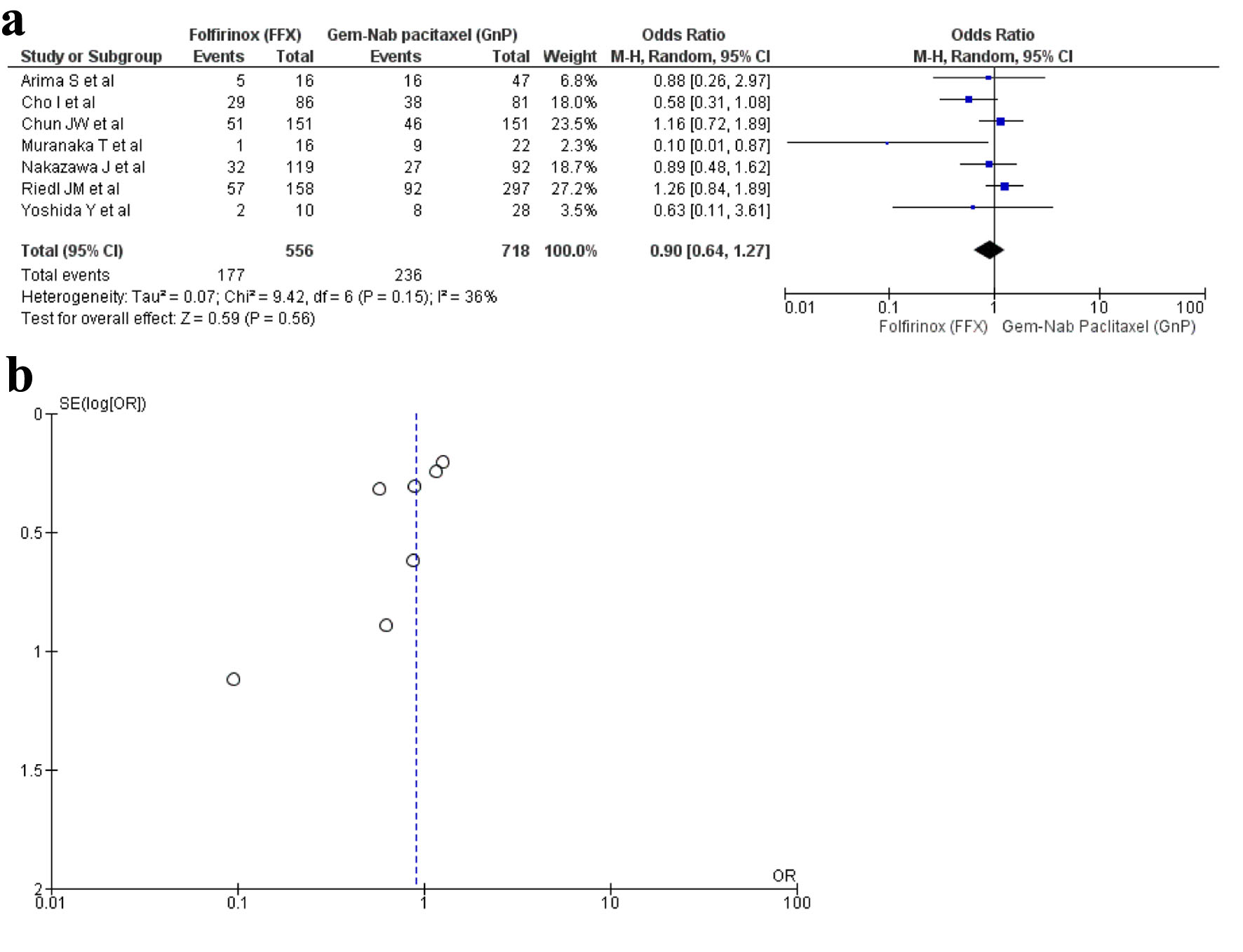 Seven studies [16, 20, 25, 27, 32, 34, 35] reported ORR with a total of 1,274 patients. There were 556 patients in the FFX arm, while 718 patients in the GnP arm. No statistical difference was observed between the use of two drugs (OR: 0.90; 95% CI: 0.64 - 1.27; P = 0.15) (Fig. 4a, b).