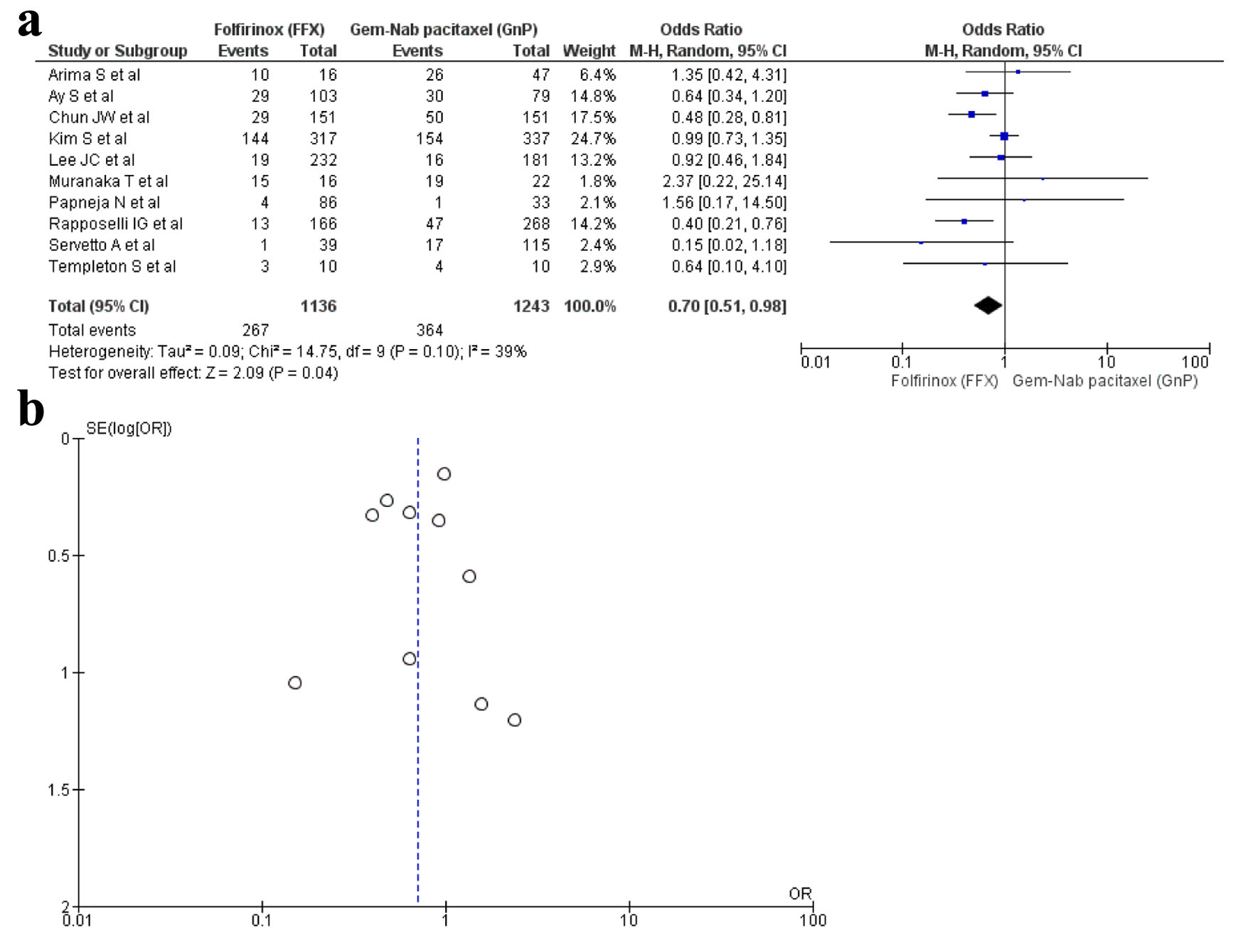 Ten studies [16, 17, 19, 22, 28-30, 33, 34, 36] reported anemia as an AE with a total of 2,379 patients. There were 1,136 in the FFX arm, while 1,243 in the GnP arm. A statistical difference was observed as anemia was observed more in the FFX arm as compared to the GnP group (OR: 0.70, 95% CI: 0.51 - 0.98; P = 0.10) (Fig. 5a, b).