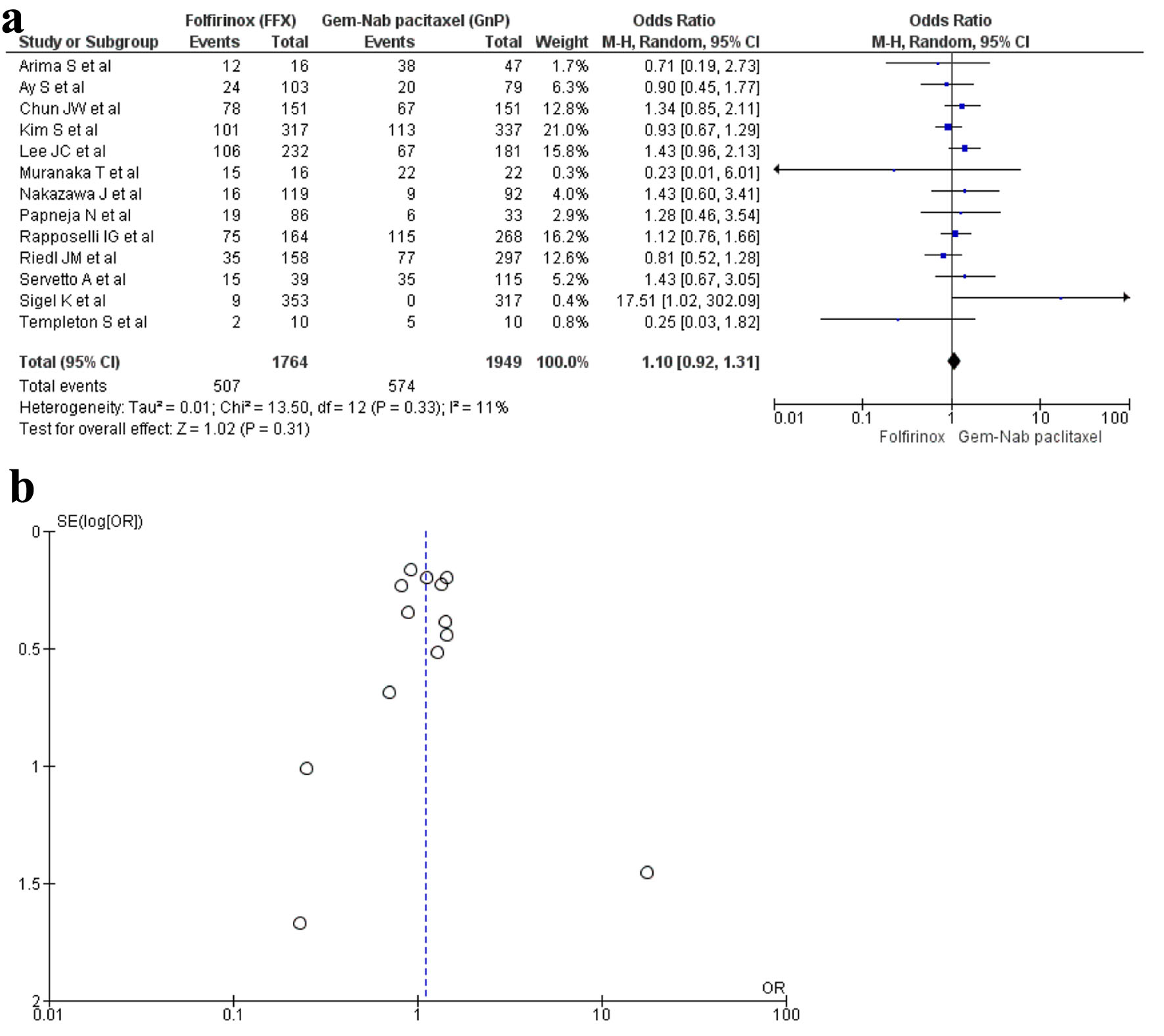 A total of 13 studies [16, 17, 19, 20, 22, 23, 28-30, 32-34, 36] with 3,713 patients reported neutropenia with 1,764 patients in the FFX group while 1,949 patients in the GnP group. The results were non-significant; hence, there was no difference seen between the two regimens in causing neutropenia (OR: 1.10; 95% CI: 0.92 - 1.31; P = 0.33) (Fig. 6a, b).