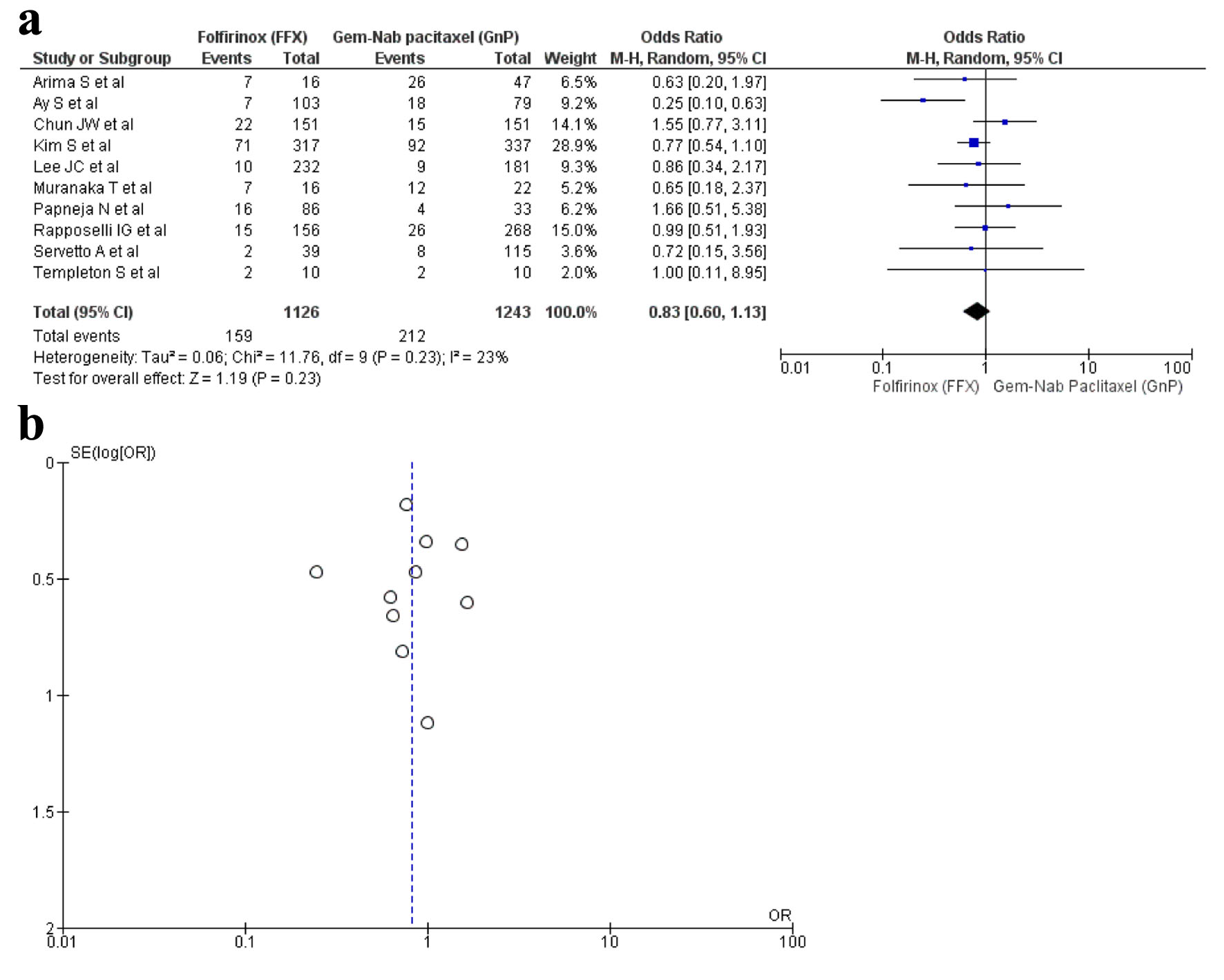 Ten studies [16, 17, 19, 22, 28-30, 32, 34, 36] reported thrombocytopenia with a total of 2,369 patients with 1,126 in FFX group in contrast to 1,243 in the GnP group. There was no statistical significance seen in the two drug choices that caused thrombocytopenia (OR: 0.83; 95% CI: 0.60 - 1.13; P = 0.23) (Fig. 7a, b).
