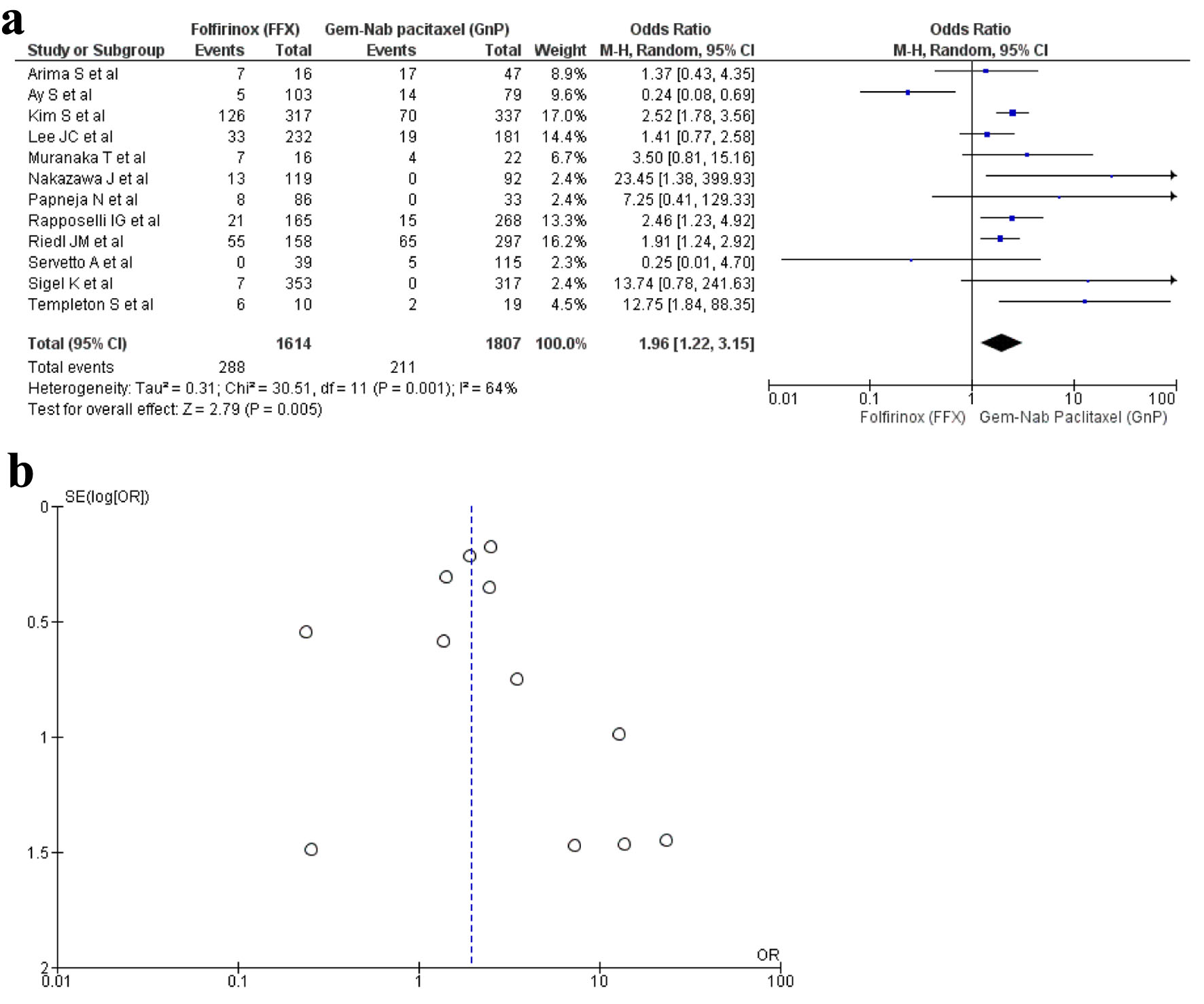 A total of 12 studies [16, 17, 19, 20, 22, 23, 29, 30, 32-34, 36] reported diarrhea as an AE with a total of 3,421 patients. A total of 1,616 patients were recorded in the FFX group and 1,807 patients in the GnP group. The results were significant as diarrhea was observed more in the GnP group when compared to FFX (OR: 1.96; 95% CI: 1.22 - 3.15; P = 0.001) (Fig. 8a, b).
