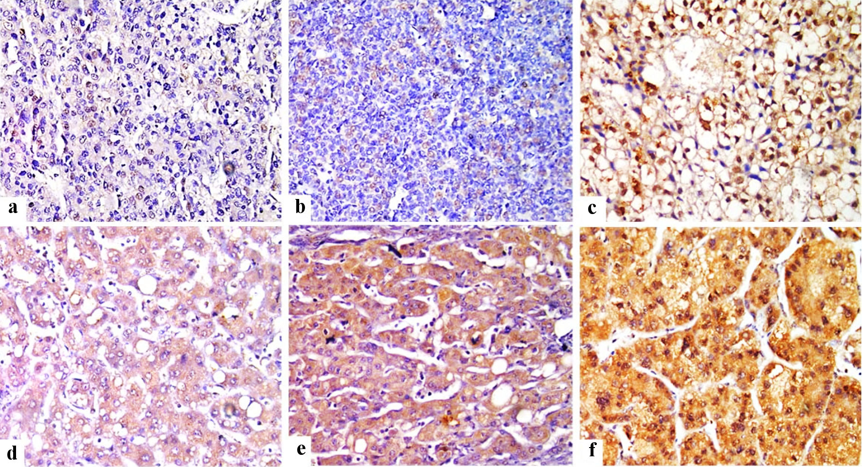 ![]() Click for large image | Figure 1. Immunohistochemical staining of FOSL1 in HCC tumor tissues (× 400) showed weak nuclear expression for FOSL1 (a), moderate nuclear expression (b), strong nuclear expression for FOSL1 (c), weak cytoplasmic expression for FOSL1 (d), moderate cytoplasmic expression (e), and strong cytoplasmic expression for FOSL1 (f). FOSL1: FOS-like antigen 1; HCC: hepatocellular carcinoma. |