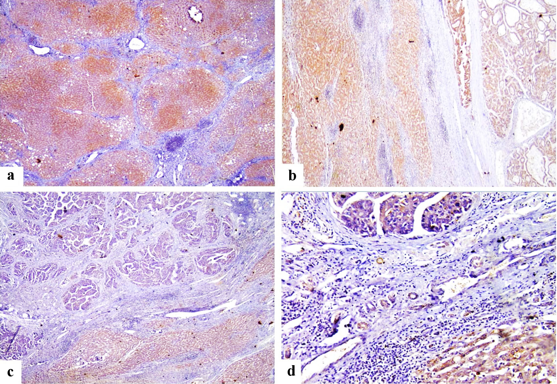 ![]() Click for large image | Figure 2. Immunohistochemical staining of FOSL1 showed strong cytoplasmic expression for FOSL1 in liver cirrhosis (a) (× 100 power magnification), strong cytoplasmic expression for FOSL1 for both liver cirrhosis and HCC (b) (× 100 power magnification), strong cytoplasmic expression for FOSL1 at liver cirrhosis and weak cytoplasmic expression for FOSL1 at HCC (c, d) (× 100 and × 200 power magnification). FOSL1: FOS-like antigen 1; HCC: hepatocellular carcinoma. |