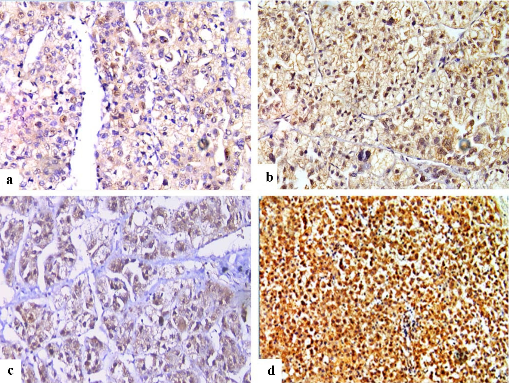 ![]() Click for large image | Figure 3. Immunohistochemical staining of FOSL1 in HCC (× 400), showed combined weak cytoplasmic and moderate nuclear expression for FOSL1 (a), combined moderate cytoplasmic and strong nuclear expression (b), combined moderate cytoplasmic and weak nuclear expression (c), and combined strong cytoplasmic expression and strong nuclear expression for FOSL1 (d). FOSL1: FOS-like antigen 1; HCC: hepatocellular carcinoma. |