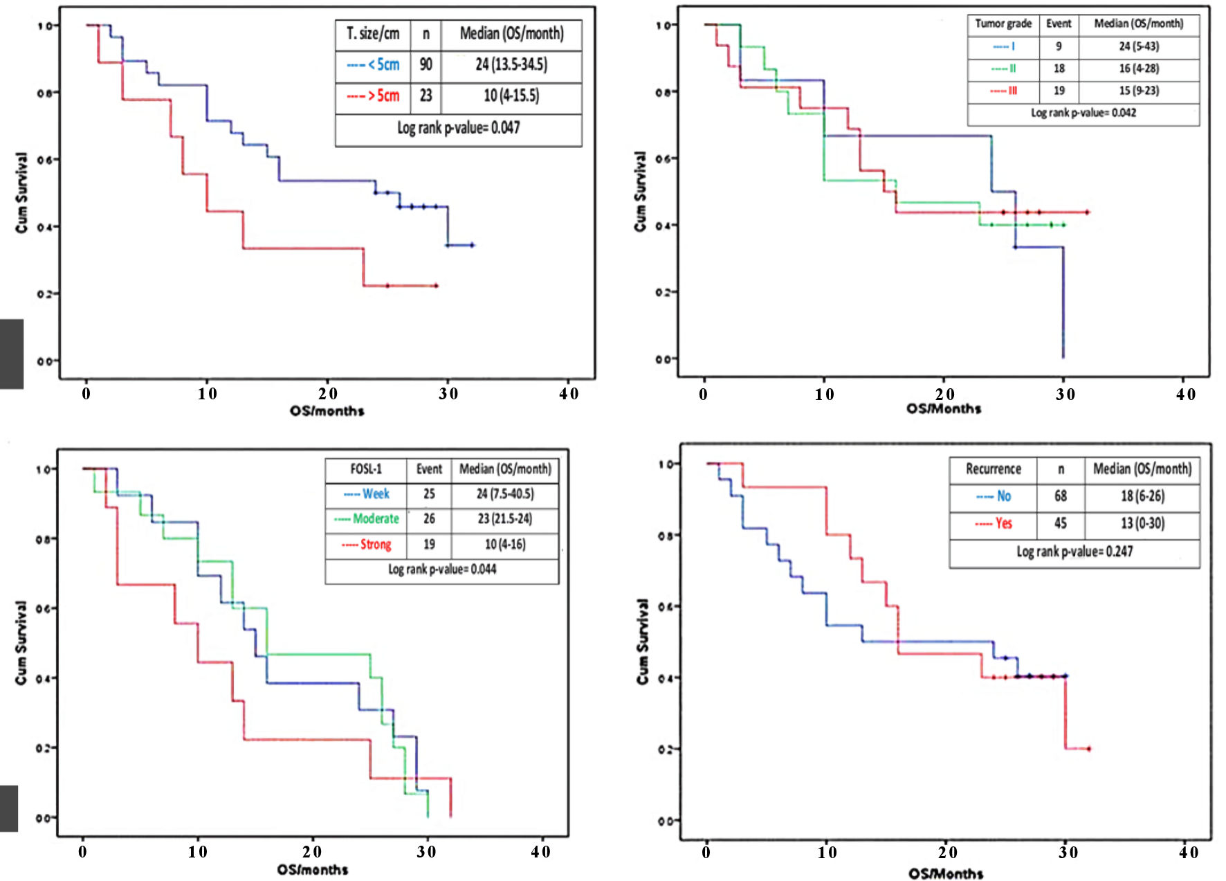 There was statistically significant correlation between tumor size and cumulative OS, where large sized tumor (> 5 cm) is associate with lower median OS time (10 (4 - 15.5 months)) than small sized tumor (< 5 cm) (24 (13.5 - 34.5 months)) (log rank P value = 0.047) (Fig. 4a). There was statistically significant gradient inverse association between tumor grade and cumulative OS, where grade III tumor had low median OS time (15 (9 - 21 months)), followed by grade II tumor (16 (4 - 28 months)), then grade I tumor with higher OS time (24 (5 - 43 months)) (log rank P = 0.042) (Fig. 4b). Furthermore, there was statistically significant steady decrease in cumulative OS as correlated with the FOSL1 level, i.e., patients with strong FOSL1 reported low median OS time (10 (4 - 16 months)), followed by those with moderate FOSL1 (23 (11.5 - 34 months)), then those with weak FOSL1 with higher OS time (24 (7.5 - 40.5 months)) (log rank P = 0.044) (Fig. 4c). Additionally, no correlation between recurrence and cumulative OS was detected. In other words, insignificantly (log rank P = 0.247) lower median OS time (13 (0 - 30 months)) was observed for patients with recurrence than those without recurrence (16 (6 - 26 months)) (Fig. 4d).