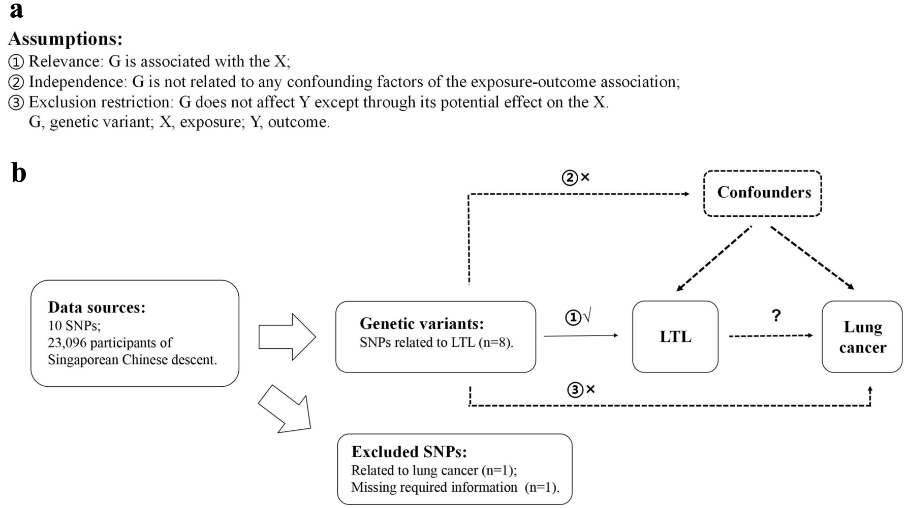 Mendelian randomization (MR), being referred to as “nature’s randomized trial”, is based on the fact that genetic variants are randomly assorted at the time of conception according to Mendel’s laws, which makes it possible to utilize genetic variants to test and estimate causal effects of exposure on the outcome. In addition, single nucleotide polymorphisms (SNPs) are the most common instrumental variables (IVs) in MR studies. In summary, MR is a worthwhile method to evaluate causality with advantages of avoiding bias due to reverse causation and confounding [19-21]. Previous MR studies have proven that longer LTL increased risk of lung cancer [22-24]. However, those studies were either based on the European population or based on never-smoking Asian women. Therefore, we conducted a two-sample MR design to estimate whether TL is the causal risk factor for risk of lung cancer in the Asian population.