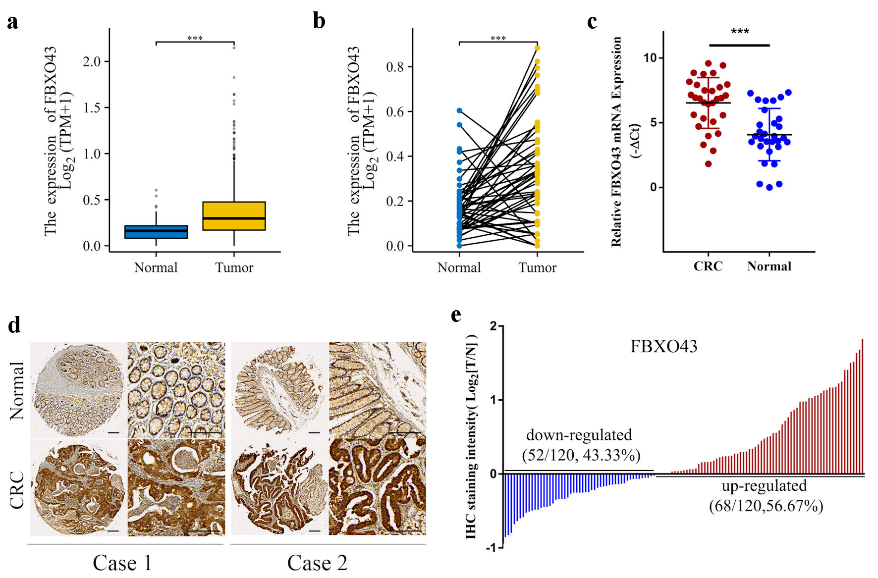 Methods: Level 3 RNA sequencing data pertaining to 631 cases of colon and rectal adenocarcinomas (COAD-READ) were downloaded from TCGA. The data were utilized to analyze the expression, prognosis, and related signal pathways of FBXO43. The expression of FBXO43 in clinical samples was subsequently confirmed through the use of real-time quantitative polymerase chain reaction (qPCR) and immunohistochemistry (IHC). Lastly, a tissue microarray (TMA) consisting of 120 cases of CRC and corresponding normal tissues was established to investigate the relationship between FBXO43 and survival outcomes.