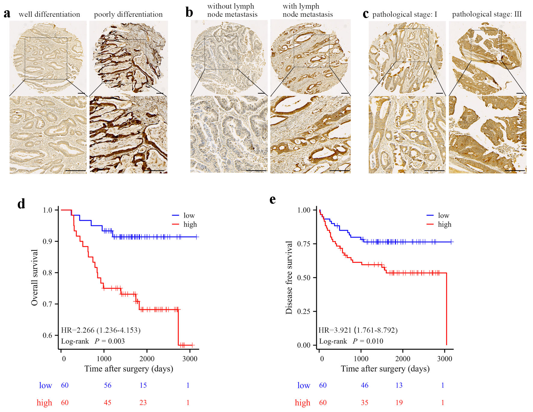![]() Click for large image | Figure 2. High level of FBXO43 was associated with poor clinical characteristics and prognosis. (a-c) Representative IHC staining of FBXO43 expression in different clinical stage CRCs: differentiation (a), lymph metastasis (b), and pathological stage (c) (scale bar: 100 µm). (d-e) OS (d) and RFS (e) of CRC patients after surgery resection were compared between the “high FBXO43” and “low FBXO43” groups using Kaplan-Meier analysis. FBXO43: F-box protein 43; IHC: immunohistochemistry; CRC: colorectal cancer; OS: overall survival; DFS: disease-free survival; HR: hazard ratio. |