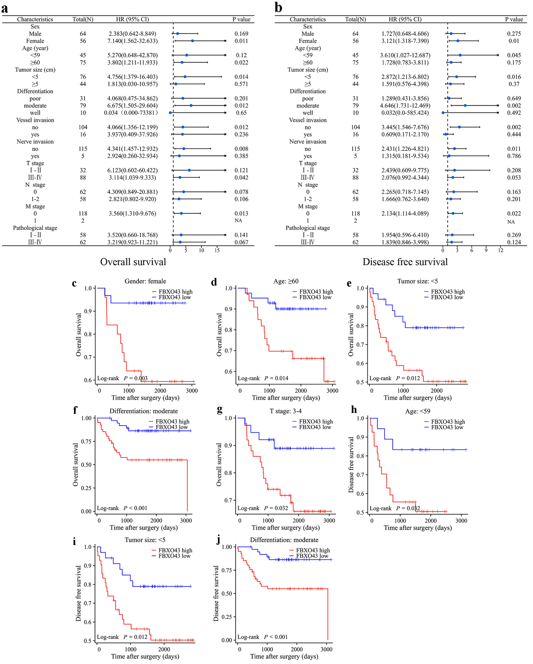 Given that age, gender, tumor stage, tumor size, and invasion are widely acknowledged factors associated with prognosis, the prognostic significance of FBXO43 across various clinical subgroups was investigated through univariate Cox regression. The results showed that patients with high FBXO43 levels had significant worse OS in several subgroup including female (P = 0.011, hazard ratio (HR) = 7.140 (1.562 - 32.633)), age ≥ 60 (P = 0.022, HR = 3.802 (1.211 - 11.933)), tumor size < 5 cm (P = 0.014, HR = 4.756 (1.379 - 16.403)), moderate differentiation (P = 0.012, HR = 6.675 (1.505 - 29.606)), no vessel invasion (P = 0.012, HR = 4.066 (1.356 - 12.199)), no nerve invasion (P = 0.008, HR = 4.341 (1.457 - 12.932)), M stage 0 (P = 0.013, HR = 3.560 (1.310 - 9.676)) and T stage III - IV (P = 0.042, HR = 3.114 (1.039 - 9.333)) (Fig. 3a). While worse DFS were observed in subgroup patients with high FBXO43 levels including female (P = 0.01, HR = 3.121 (1.318 - 7.390)), age < 59 (P = 0.045, HR = 3.610 (1.027 - 12.687)), tumor size < 5 cm (P = 0.016, HR = 2.872 (1.213 - 6.802)), moderate differentiation (P = 0.002, HR = 4.646 (1.731 - 12.469)), no vessel invasion (P = 0.002, HR = 3.445 (1.546 - 7.676)), no nerve invasion (P = 0.011, HR = 2.431 (1.226 - 4.821)) and M stage 0 (P = 0.022, HR = 2.134 (1.114 - 4.089)) (Fig. 3b). Additionally, Kaplan-Meier survival analysis revealed consistent prognostic value in those subgroups (Fig. 3c-j). These data suggested that FBXO43 could be an effective parameter for stratifying low-risk CRC patients.