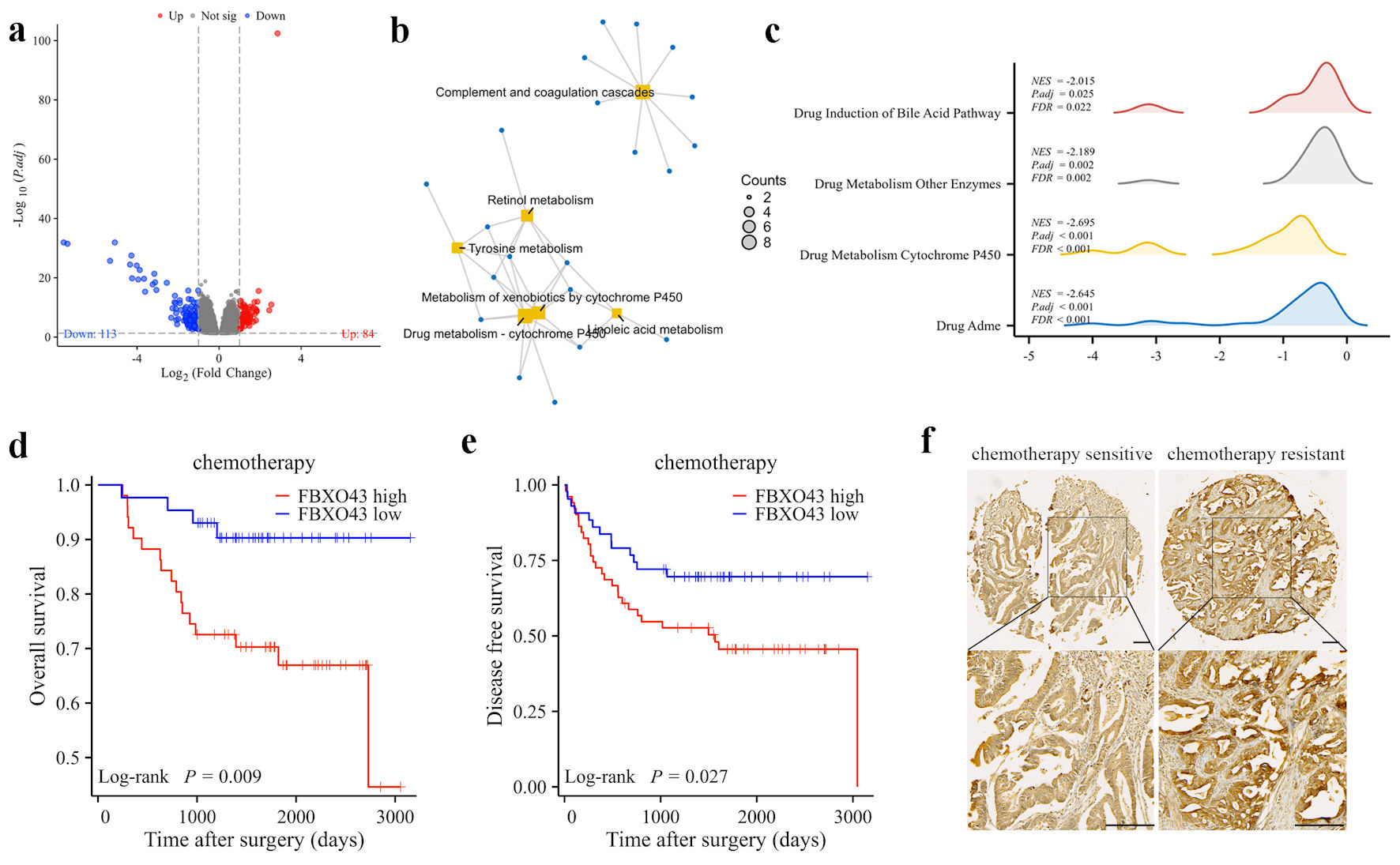 To explore the potential biological function of FBXO43 in CRC, differential expression profiles were examined between TCGA CRC samples that expressed high (70-100%) and low (0-30%) levels of FBXO43. A total of 84 upregulated genes and 113 downregulated genes were identified in the group with high expression of FBXO43 (|log2FC| > 1, adjusted P < 0.05) (Fig. 4a). The results of the KEGG signaling pathway enrichment analysis indicate that the DEGs were significantly enriched in various metabolic pathways, including drug metabolism - cytochrome P450, complement and coagulation cascades, metabolism of xenobiotics by cytochrome P450, tyrosine metabolism, retinol metabolism, and linoleic acid metabolism (Fig. 4b). Besides, GSEA was ulteriorly conducted in patients with high and low expression of FBXO43 in TCGA, and several drug-metabolism related pathways were conspicuously restrained including drug induction of bile acid pathway, drug metabolism other enzymes, drug metabolism cytochrome P450 and drug absorption, distribution, metabolism, and excretion (ADME) (Fig. 4c). Hence, we postulated that FBXO43 may contribute to chemotherapy response for CRC patients. Subsequent analysis of data from 94 out of 120 patients (43 out of 60 in FBXO43 low group and 51 out of 60 in FBXO43 high group), who underwent surgical resection and received at least three courses of adjuvant folinic acid/5-fluorouracil/oxaliplatin (FOLFOX) chemotherapy was conducted to validate the efficacy of FBXO43 in adjuvant chemotherapy. According to the results, patients with high FBXO43 levels had significantly shorter OS and DFS than those with low levels (Fig. 4d, e). Among patients undergoing adjuvant chemotherapy, those who exhibited recurrence of tumor within 1 year were considered chemotherapy-resistant, and those with a DFS more than 5 years were considered chemotherapy-sensitive. We further reviewed the expression of FBXO43 in primary CRC tissues obtained from chemotherapy-resistant patients. There is a significant increase of FBXO43 expression in chemotherapy-resistant patients’ primary CRC tissues compared to those with chemotherapy-sensitive CRC (Fig. 4f). These results suggest that patients with elevated levels of FBXO43 expression may not derive therapeutic benefits from chemotherapy following surgical resection.