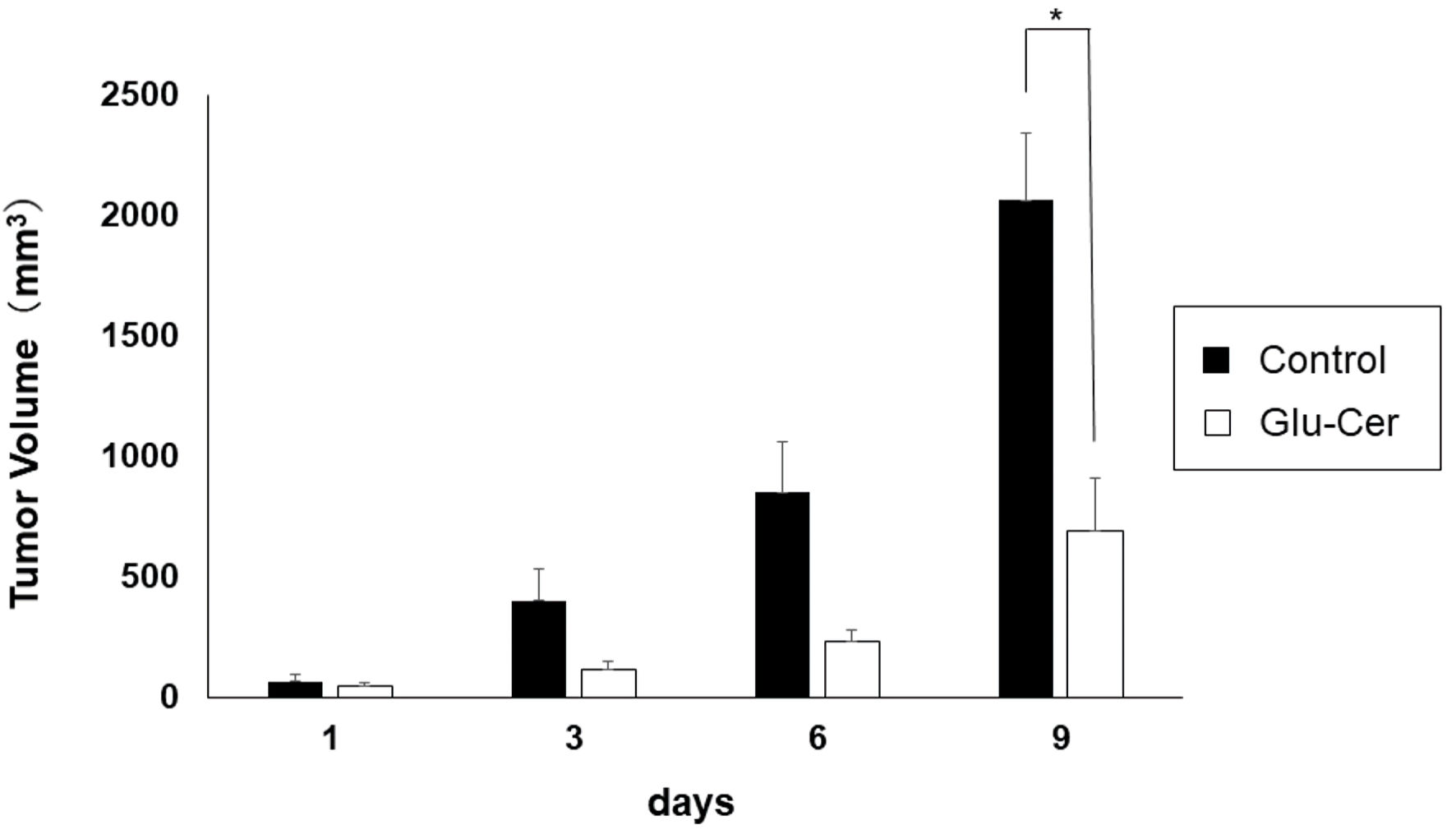We first investigated the effect of orally administered Glu-Cer on E0771 murine tumor growth. We found that oral Glu-Cer significantly suppressed tumor growth in xenograft mice (Fig. 1). The mean volumes of tumors in the Glu-Cer group on days 1, 3, 6 and 9 were 32 mm3, 96 mm3, 345 mm3, and 690 mm3, respectively. The mean volumes of tumors in the control group on days 1, 3, 6 and 9 were 33 mm3, 208 mm3, 836 mm3, and 2061 mm3, respectively. There was a significant difference in tumor volume between the Glu-Cer and control groups on day 9 (P = 0.006).