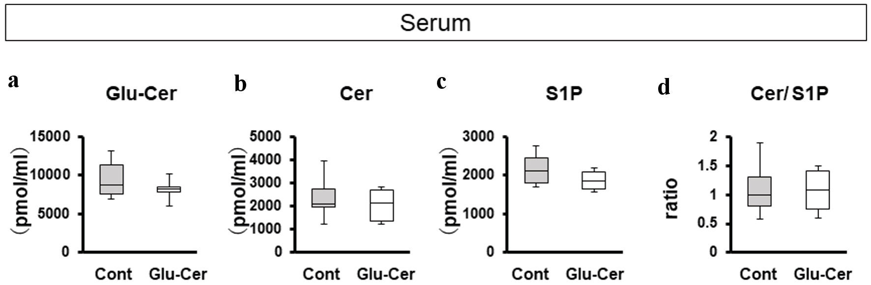 Since orally administered Glu-Cer is absorbed from the gut and presumably taken into circulation, it was of interest to investigate the sphingolipid concentrations in the serum between the Glu-Cer group (n = 10) and the control group (n = 10). Interestingly, there was no significant difference in the serum concentrations of sphingolipid mediators; Glu-Cer, Cer, S1P nor Cer/S1P ratio between the Glu-Cer group and the control group (Fig. 2a-d).