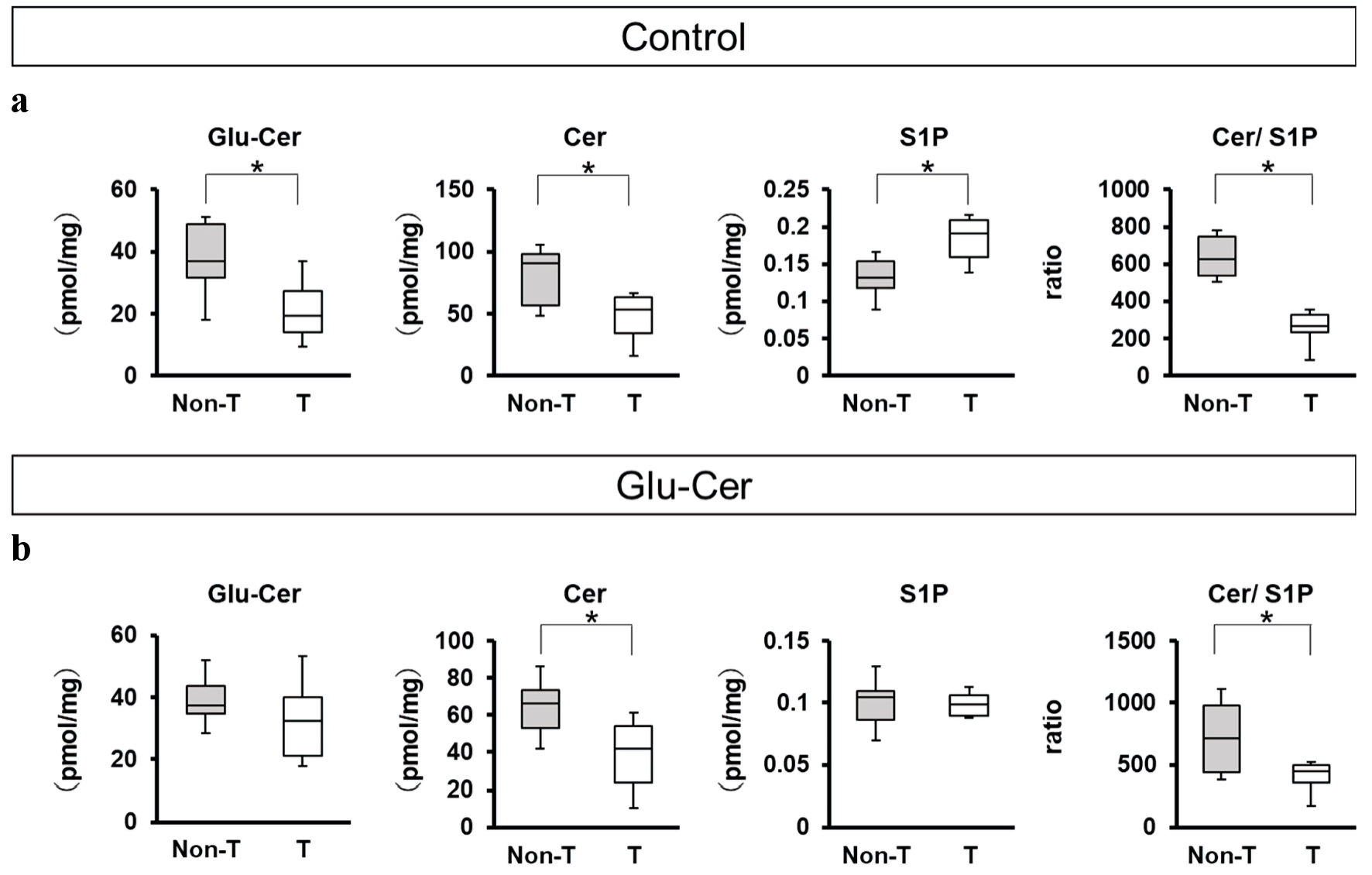 ![]() Click for large image | Figure 3. Comparison of sphingolipid concentrations between paired tumor and non-tumor tissues. The sphingolipids concentrations of mice treated without glucosylceramide (Glu-Cer) (n = 10) (a) and mice treated with Glu-Cer (n = 10) (b) were determined by mass spectrometry (n = 10 for each group). The concentrations of Glu-Cer, ceramide (Cer), and sphingosine-1-phosphate (S1P) and the ratio of the Cer concentration to that of S1P (Cer/S1P) were compared between paired mouse breast cancer tissue and normal breast tissue. Mean values are shown as horizontal lines. The Mann-Whitney U test was performed for statistical analysis, all tests were two-tailed, and P < 0.05 was considered significant (shown as an asterisk). T: the tumor group; Non-T: the non-tumor group. |