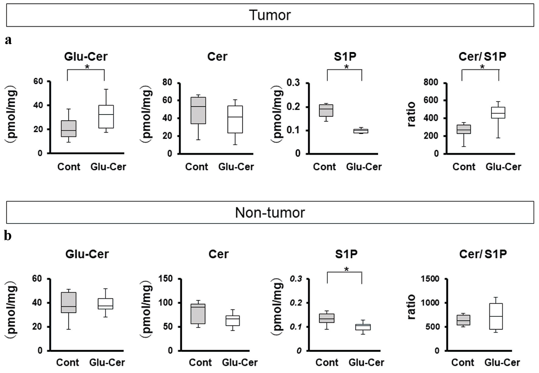 We compared sphingolipid concentrations between breast tumor tissues (n = 10) and paired non-tumor tissues (n = 10) in the control group (Fig. 3a) and in the Glu-Cer group (Fig. 3b). In the control group, tumor tissues had significantly lower concentrations of Glu-Cer (median, 19.2 pmol/mg vs. 37.0 pmol/mg, P = 0.030) and Cer (median, 53.1 pmol/mg vs. 91.0 pmol/mg, P = 0.026) than paired non-tumor tissues (Fig. 3a). The S1P concentration was significantly higher in tumor tissues than in non-tumor tissues (median, 0.19 pmol/mg vs. 0.13 pmol/mg, P = 0.009) (Fig. 3a). The ratio of the Cer concentration to that of S1P in tumor tissues was significantly lower than that in paired non-tumor tissues (median, 269 vs. 627, P = 0.040) (Fig. 3a). In the Glu-Cer group, tumor tissues had significantly lower concentration of Cer (median, 41.9 pmol/mg vs. 66.5 pmol/mg, P = 0.035). The ratio of the Cer concentration to that of S1P in tumor tissues was significantly lower than that in paired non-tumor tissues (median, 443 vs. 714, P = 0.034) (Fig. 3b).