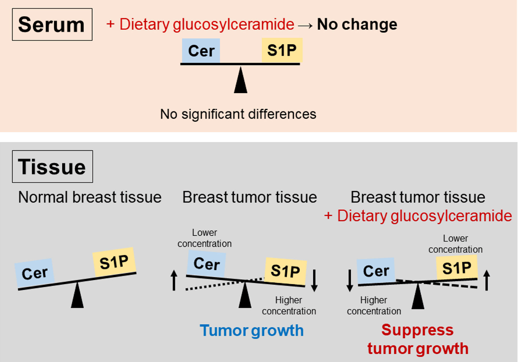 Conclusions: Breast tumors could enhance their survival by increasing S1P conversion from ceramide. Oral administration of glucosylceramide suppressed tumor growth by affecting the ceramide/S1P balance. Oral administration of glucosylceramide is a promising basis for a new therapeutic approach.