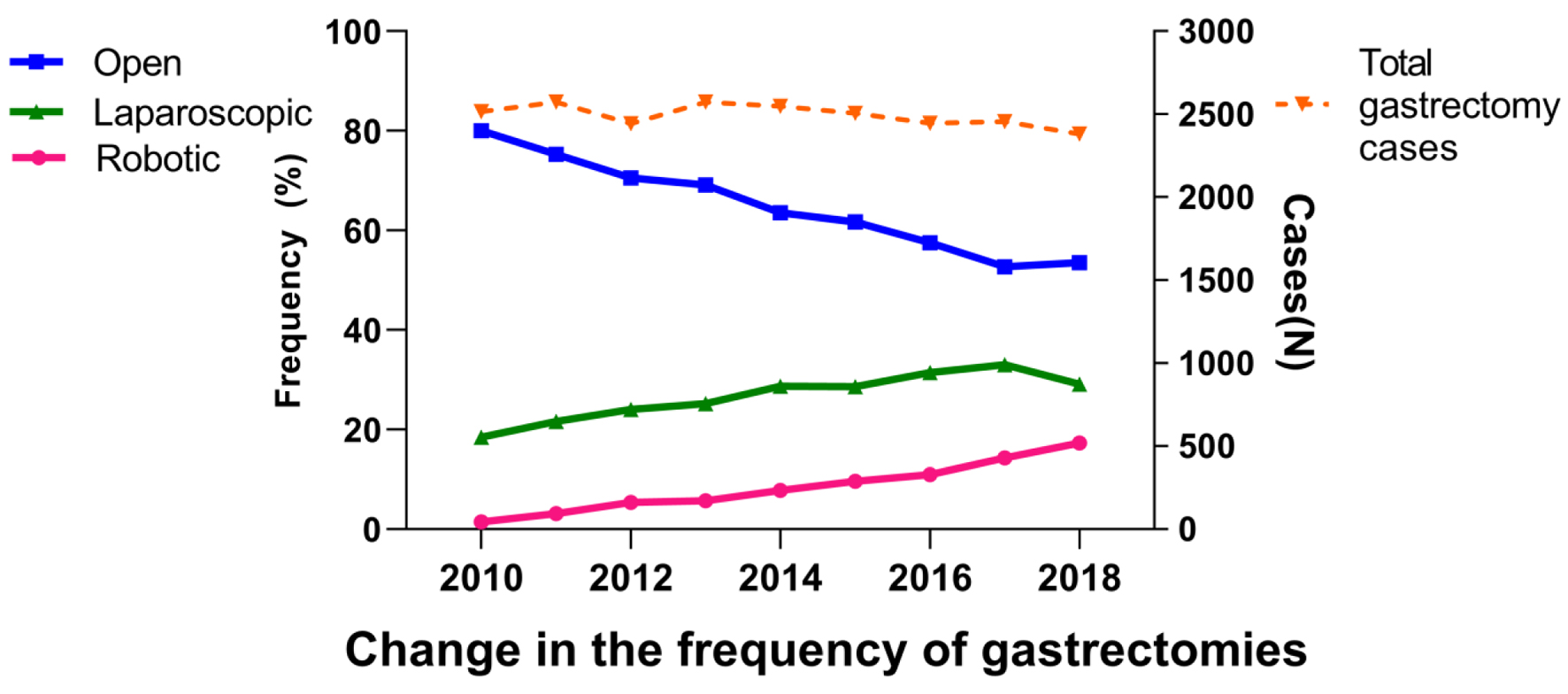 Methods: We used the National Cancer Database to identify patients who underwent major gastrectomy from 2010 through 2018. The short-term safety outcomes and oncological metrics were compared between cases of open gastrectomy (OG), laparoscopic gastrectomy (LG), and RG. We also compared the indications and outcomes of RG between the three periods (2010 - 2012, 2013 - 2015, and 2016 - 2018).