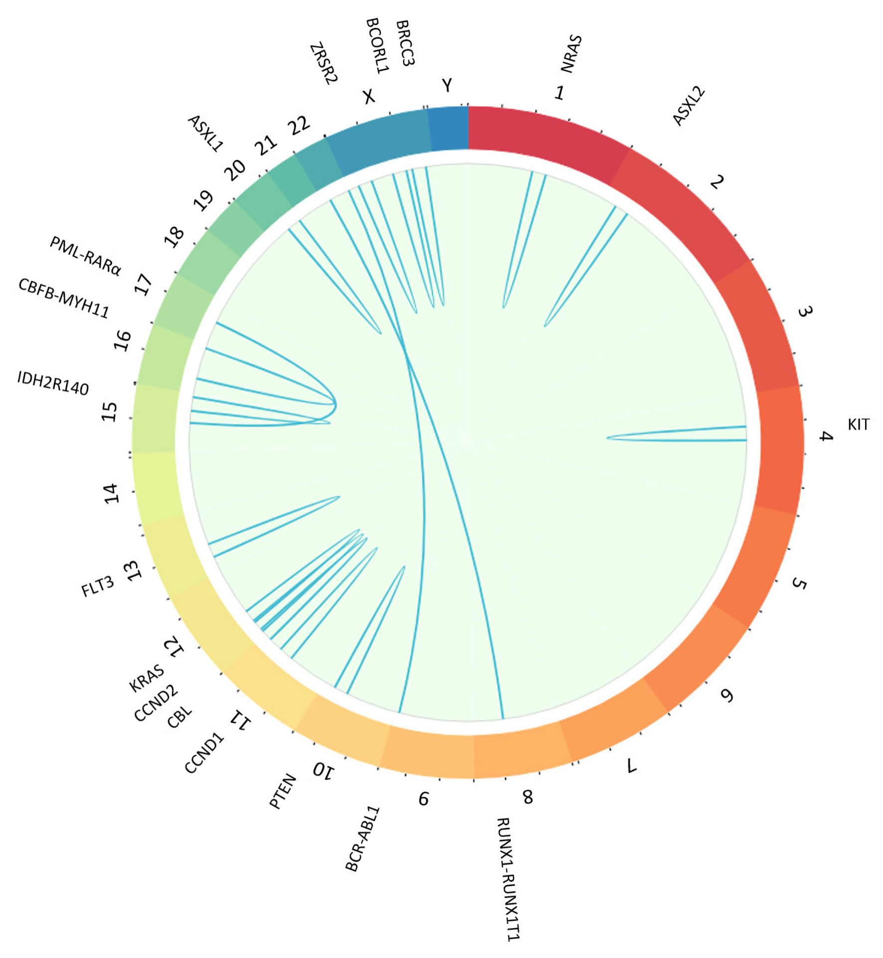 ![]() Click for large image | Figure 1. Plot created with BioCircos package in R showing with sky-blue lines secondary genetic mutations and gene fusions found in core binding factor acute myeloid leukemia (CBF-AML) cases in Mitelman Database. Chromosomes are individually colored and arranged clockwise from chromosome 1 to Y. We showed only mutations with a frequency greater than 1, and there were no rearrangements involving the Y chromosome. NRAS: neuroblastoma RAS viral gene mutation; ASXL2: ASXL transcriptional regulator 2 gene mutation; RUNX1-RUNX1T1: RUNX1-RUNX1 partner transcriptional co-repressor 1 genes fusion; BCR-ABL1: BCR-ABL1 fusion gene mutation; PTEN: phosphatase and tensin homolog gene mutation; CCND1: cyclin D1 gene mutation; CCND2: cyclin D2 gene mutation; CBL: casitas B-lineage lymphoma gene mutation; KRAS: Kirsten rat sarcoma virus gene mutation; FLT3: FMS-like tyrosine kinase 3 gene mutation; IDH2R140: isocitrate dehydrogenase 2 R140 gene mutation; CBFB-MYH11: core binding factor beta subunit-myosin heavy chain 11 genes fusion; PML-RARa: promyelocytic leukemia/retinoic acid receptor alpha gene mutation; ASXL1: ASXL transcriptional regulator 1 gene mutation; ZRSR2: zinc finger, RNA-binding motif and serine/arginine rich 2 gene mutation; BCORL1: BCORL1 gene mutation; BRCC3: BRCA1/BRCA2-containing complex 3 gene mutation. |