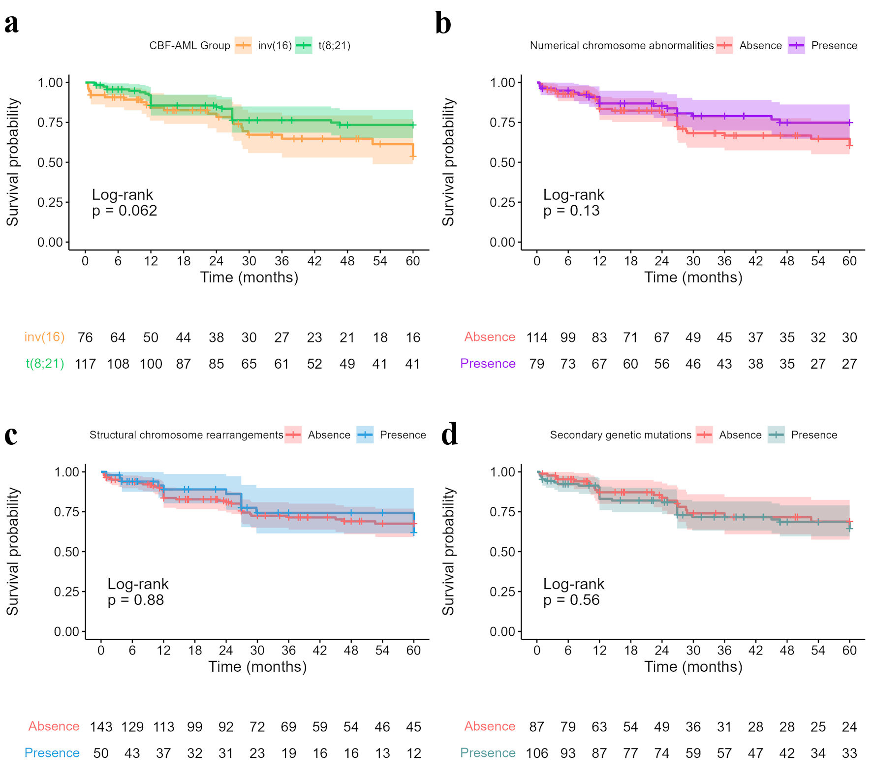 Methods: Using the Mitelman Database of Chromosome Aberrations and Gene Fusions in Cancer, we analyzed 193 cases of CBF-AML reported between 2011 and 2021. We conducted a survival analysis to determine the 5-year OS, and we conducted univariate and multivariate Cox regression to identify independent genetic factors related to OS.