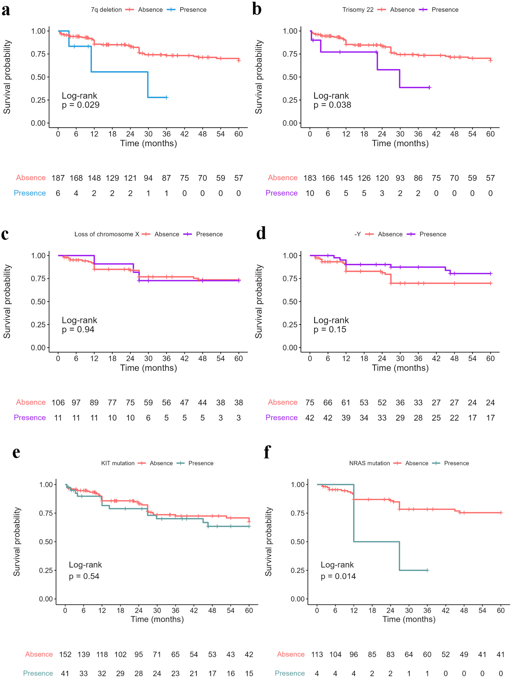 However, among individual survival analyses of secondary genetic aberrations, we found a difference in the 5-year OS long-rank test with the presence of 7q deletion (“del(7)”), trisomy 22 (“+22”) and NRAS mutations (Fig. 3). The 5-year OS for the presence of del(7) was significantly worse (27.8% versus 67.7%, P = 0.029) in terms of 5-year OS in the Cox univariate analysis (HR: 3.40; 95% CI: 1.00 - 11.00; P = 0.041). The 5-year OS of patients with and without trisomy 22 was 38.6% and 67.9%, respectively (P = 0.038), thus indicating a shorter OS in the presence of the aberration (HR: 2.8; 95% CI: 1.00 - 7.90; P = 0.049). In addition, we found that NRAS mutation had a worse 5-year OS in the t(8;21) group (25.0% versus 75.4%, PL = 0.014), with an HR of 4.00 (95% CI: 1.20 - 13.00; P = 0.025). However, when the total sample was included in this analysis, we found no significant difference.