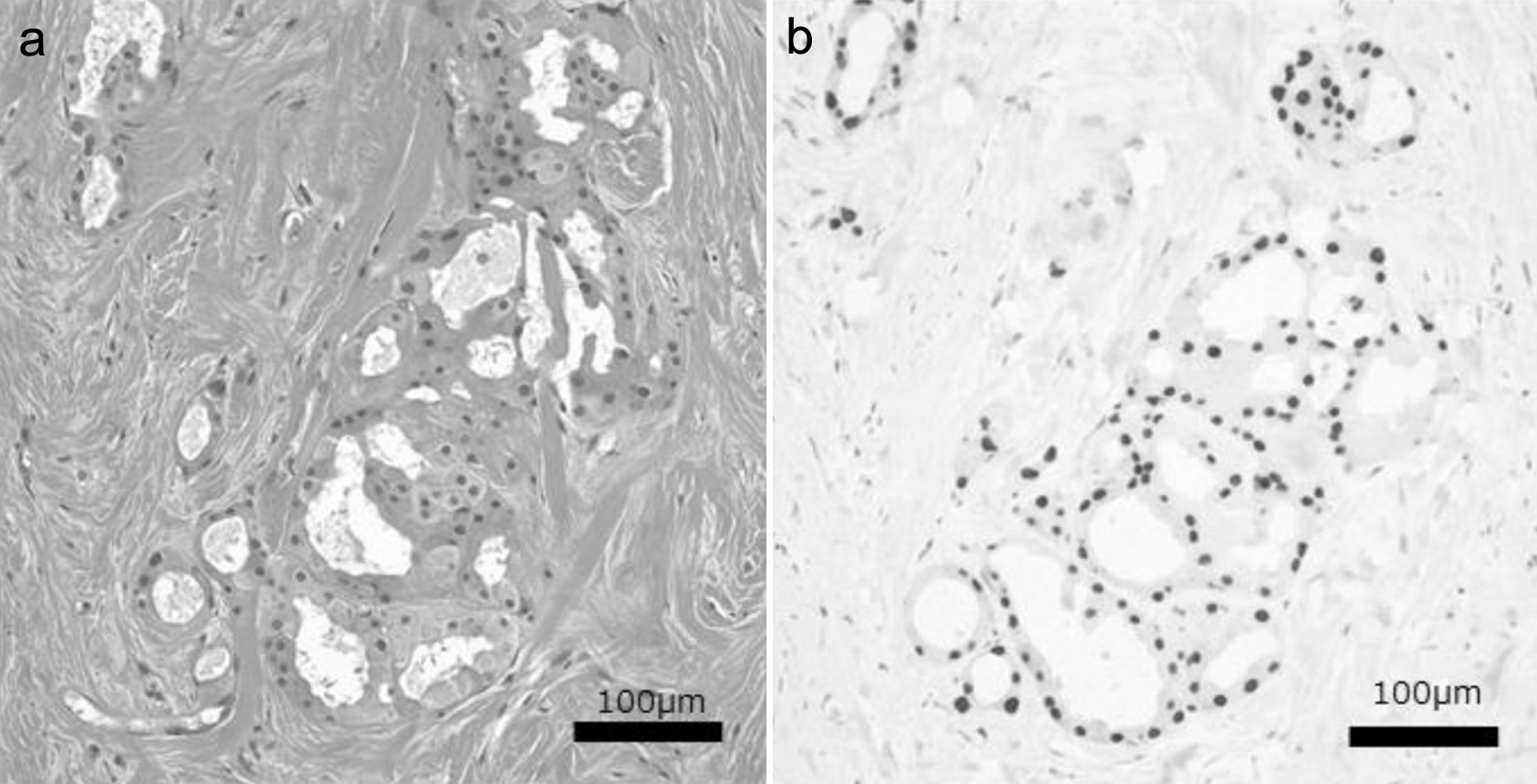 Patient characteristics are shown in Table 1. The median age at diagnosis was 67 (43 - 94) years, and the median observation time was 6.1 (range: 0.2 - 14.9) years. In total, 44 cases (83.0%) were patients in post-menopause. ER and HER2 expression was positive in 13 (24.5%) and 11 (20.8%) cases, respectively. TN breast cancer was detected in 31 cases (58.4%). Moreover, 42 cases (79.2%) were AR-positive, and 24 cases (45.3%) were diagnosed as TN-PAC. Figure 1 shows the hematoxylin and eosin (H&E) and AR staining images of a representative TN-PAC case. A total of 29 cases were grouped as other-AC, including 22 cases of cancer other than TN breast cancer and seven cases of TN breast cancer without AR expression (Fig. 2).