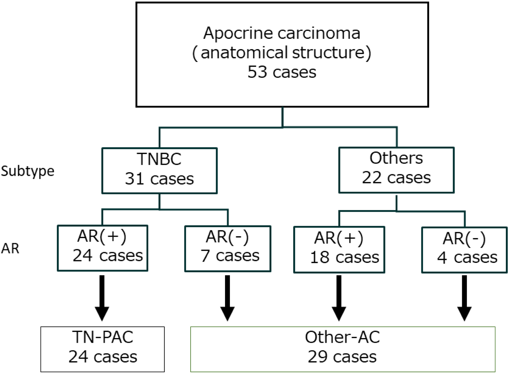 Tumors were classified into two groups using IHC results: TN-PAC, defined as TN AC with AR expression, and other-AC, defined as other ACs apart from TN-PAC. We compared the clinicopathological factors and prognoses between the two groups.