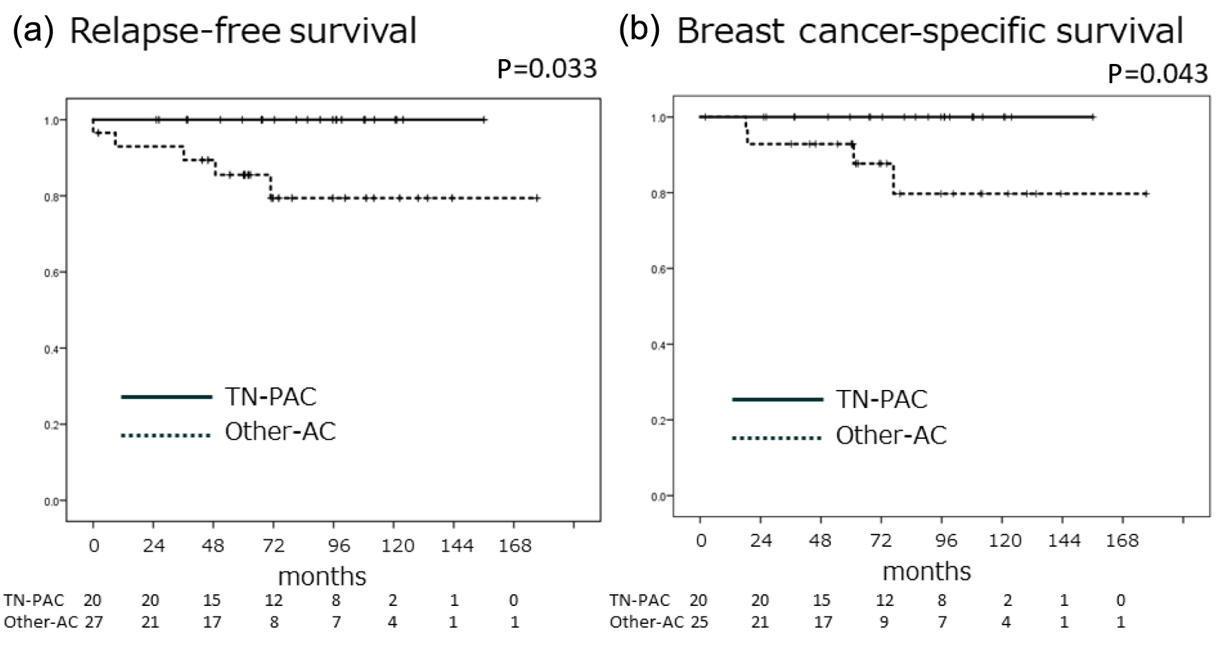 A comparison of clinicopathological factors between TN-PAC and other-AC groups is shown in Table 1. There were no significant differences between the two groups in age, hormonal status, Ki-67 index, nuclear grade, stage classification, and surgical procedure (Table 1). Tumor size was smaller in the TN-PAC group than in the other-AC group (1.4 vs. 2.1 cm, P = 0.024), and metastasis was observed in fewer nodes in the TN-PAC group than in the other-AC group (12.5% vs. 37.9%, P = 0.036). In the reflected node status, the TN-PAC group received less axillary dissection than the other-AC group (20.8% vs. 55.2%, P = 0.013).