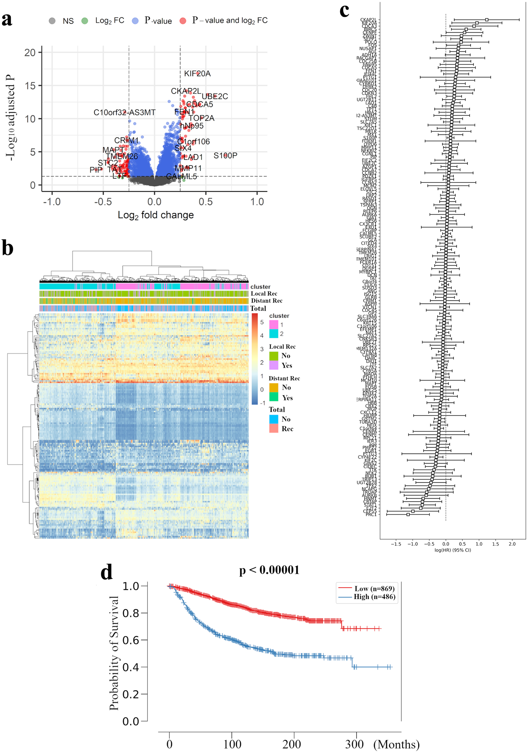 In order to build an RPM, we examined the relation between abundance of mRNA expression and distant recurrence with METABRIC as a discovery cohort. Figure 1a shows volcano plots that represent the distribution of the fold changes and adjusted P-values of 18,484 genes in METABRIC HR+ HER2- cohort with and without distant recurrence. We identified 155 distant recurrence-related genes, which were differentially expressed with |log2 fold-change| greater than 0.25 and adjusted P < 0.05, with the complete list of these genes and their adjusted P values being provided in Supplementary Material 2 (www.wjon.org). A bidirectional hierarchical clustering heatmap, based on the expression levels of the identified differentially expressed genes (DEGs), indicated the relationship between clustering of the samples into two groups and type of recurrence (Fig. 1b). Analysis of the combined hazard ratio logarithms of all 155 extracted genes suggests that further refinement is necessary for prognostic prediction (Fig. 1c). Using the Cox-PH model, the optimal combination of prognostic genes was further screened from the 155 feature genes. Consequently, 23 DEGs were revealed to be closely involved in METABRIC HR+ HER2- patients’ distant RFS (P < 0.05) (Supplementary Material 3, www.wjon.org). Combining the Cox-PH model and recursive feature elimination, we sequentially removed genes with P ≥ 0.05 from the 23 genes, and finally extracted the nine best predictors with P < 0.05 (Table 2).