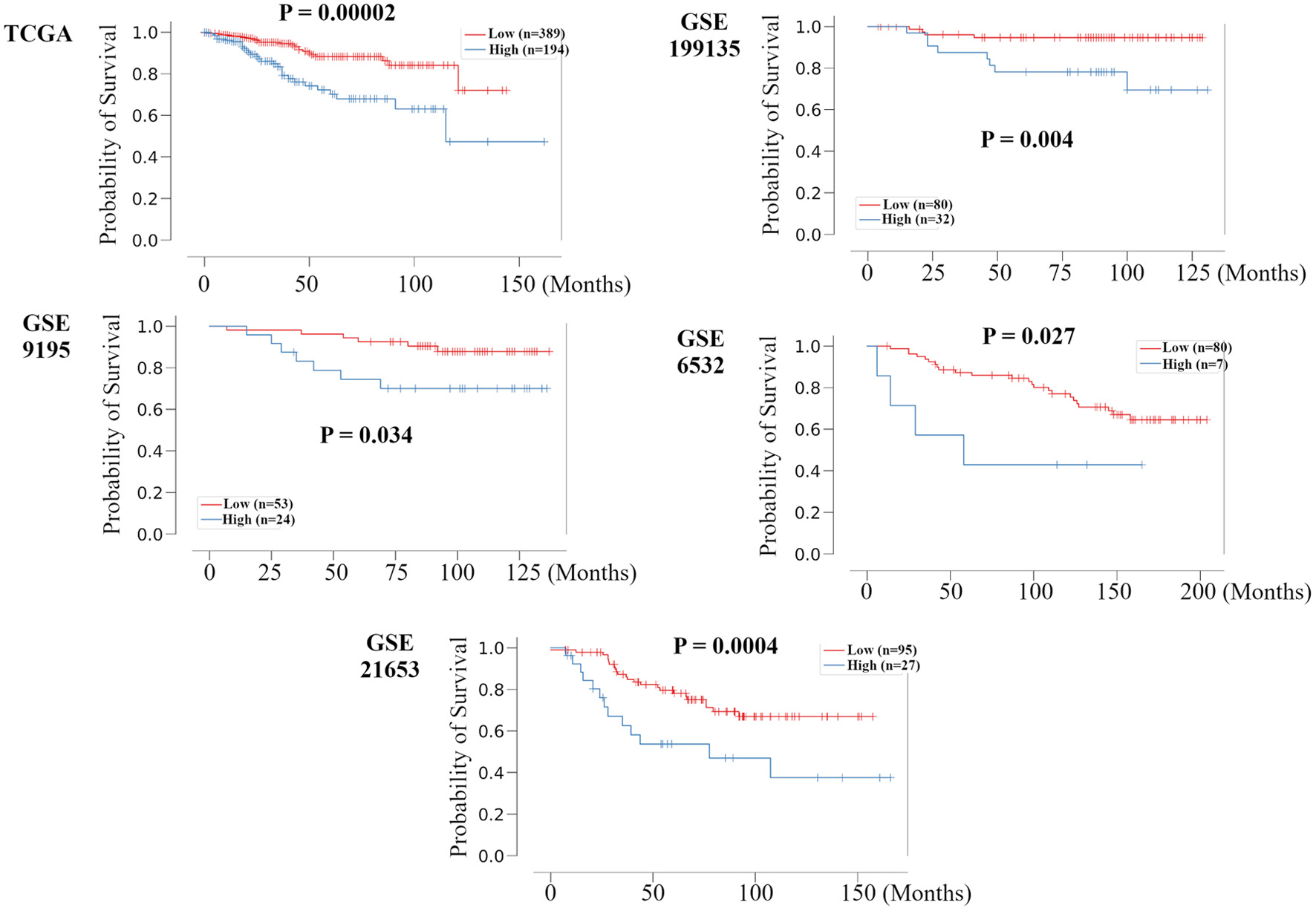 However, these tools are not universal, as they are limited to clinical factors such as HRs, menopausal status, and nodular status [9]. It remains unclear which gene assay should be prioritized, and prognosis and prediction differ between tests [5]. There remains a significant need for an unbiased and comprehensive approach to identify and list all prognosis-related molecules [5, 10-12]. Innovations in high-throughput technology have led to the rapid accumulation of data on gene expression throughout the transcriptome of tumors from large numbers of patients. The study of such accumulated data by the research community is a very important study to identify more accurate potential biomarkers at the individual patient level [13]. With these cohorts and algorithms, we have conducted studies that assess the real-world relevance of expression of genes of interest [14-24].