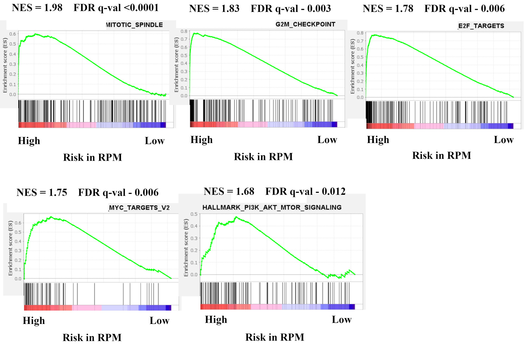 In order to investigate which mechanism is related to the RPM, we examined gene sets associated with high-risk tumors in the RPM using the GSEA (Fig. 3). Pathway enrichment analysis revealed that five significant pathways were enriched for high-risk tumors; cell cycle related gene sets (mitotic spindle; NES = 1.98, FDR q < 0.0001, G2/M check point; NES = 1.83, FDR q = 0.003, E2F targets; NES = 1.76, FDR q = 0.006), MYC target v2 (NES = 1.68, FDR q = 0.006), and PI3K-AKT-mTOR signaling (NES = 1.68, FDR q = 0.012). No gene set was enriched among 50 hallmark gene sets with low-risk tumors.