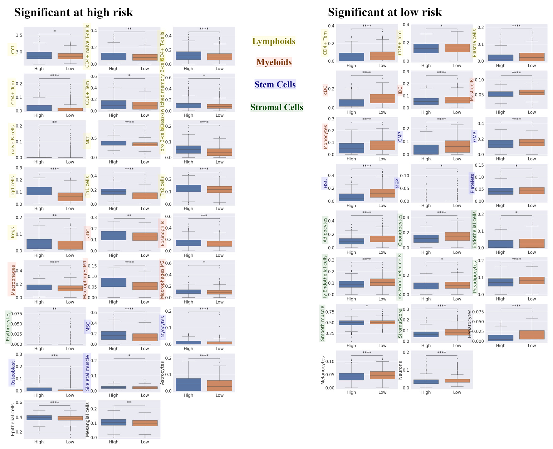 High-risk tumors were associated with high levels of immune cells from the lymphoid and myeloid lineage and immune cytolytic activity, and low levels of stem cells and stromal cells
