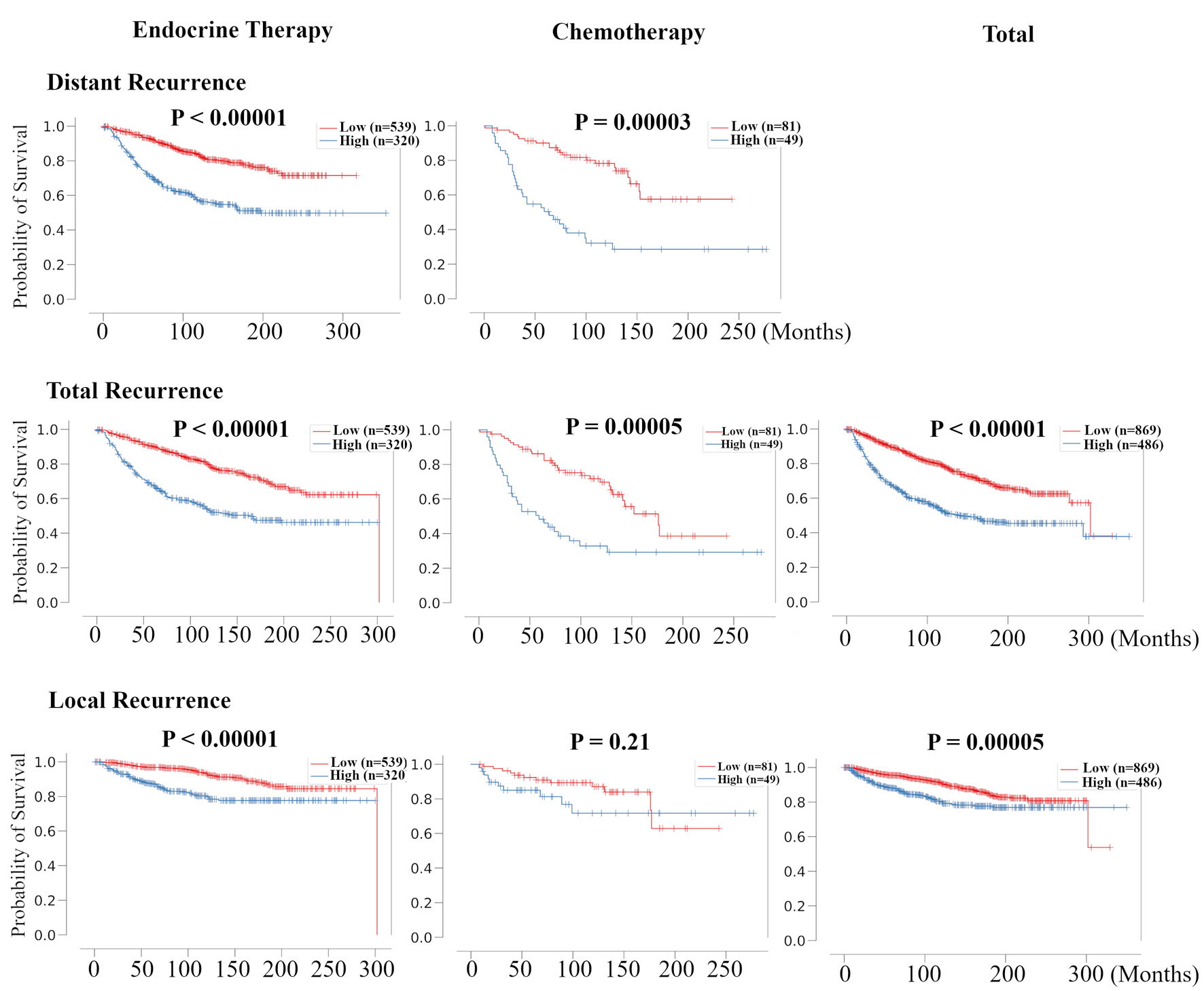 ![]() Click for large image | Figure 5. Validation of the relationship between risk classification in recurrence prediction model and the therapeutic effect of chemotherapy and endocrine therapy for HR+ HER2- BC patients. Kaplan-Meier plots of distant RFS, total RFS, and local RFS of the association between recurrence risk in recurrence prediction model and chemotherapy- and endocrine-treated patients in METABRIC HR+ HER2- cohort are shown. For total RFS and local RFS, Kaplan-Meier plots of total recurrence are shown on the far right. HR+: hormone receptor positive; HER2: human epidermal growth receptor 2; RFS: recurrence free survival; METABRIC: Molecular Taxonomy of Breast Cancer International Consortium. |