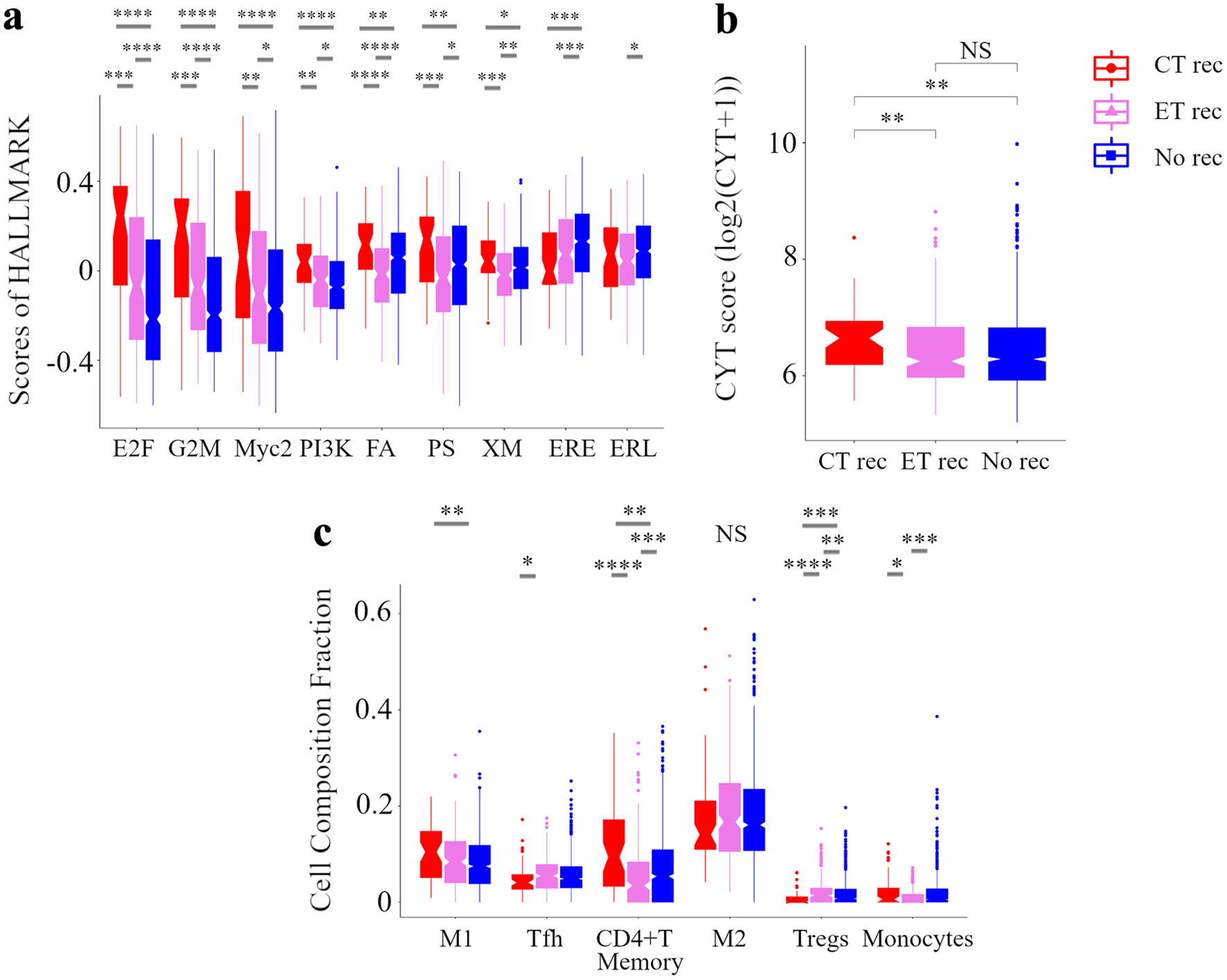 Further, we explored the relationship between treatment outcomes and signaling pathways using GSVA, immune cytolytic activity, and immune cell composition in the METABRIC HR+ HER2- cohort (Fig. 6). Based on treatments and recurrence, we classified patients into following three groups: patients treated with CT but relapsed as “CT rec”, patients treated with ET alone but relapsed as “ET rec”, and patients treated with ET with or without CT and who did not relapse as “No rec”. E2F targets, G2M checkpoint, Myc targets v2, and PI3K-AKT-mTOR signaling GSVA scores were highest in the “CT rec” group and lowest in the “No rec” group. High risk of RPM tumors was indeed correlated with these signaling pathways (Fig. 3). Other notable findings were that fatty acid metabolism, protein secretion, and xenobiotic metabolism scores were the highest in the “CT rec” group and the lowest in “ET rec” group. ESTROGEN_RESPONSE_EARLY score was highest in the “No rec” group. In analyzing the relationship amongst the three groups in breast TIME, the immune cytolytic activity scores were the highest in the “CT rec” group. High risk of an RPM tumor was indeed correlated with high immune cytolytic activity scores (Fig. 4). Regarding the immune cell composition, immunostimulatory cells, M1 macrophages were higher in the “CT rec” group compared with the “No rec” group, and follicular helper T cells were lower in the “CT rec” group compared with the “ET rec” group. Immunosuppressive Tregs were the lowest in the “CT rec” group. Additionally, monocytes were found to be higher in the “CT rec” group compared with the “ET rec” group. These results indicate that high-risk tumors among patients in the RPM were associated with poor treatment efficacy, which was supported by their correlation with pathway and TIME, which were involved in treatment resistance.