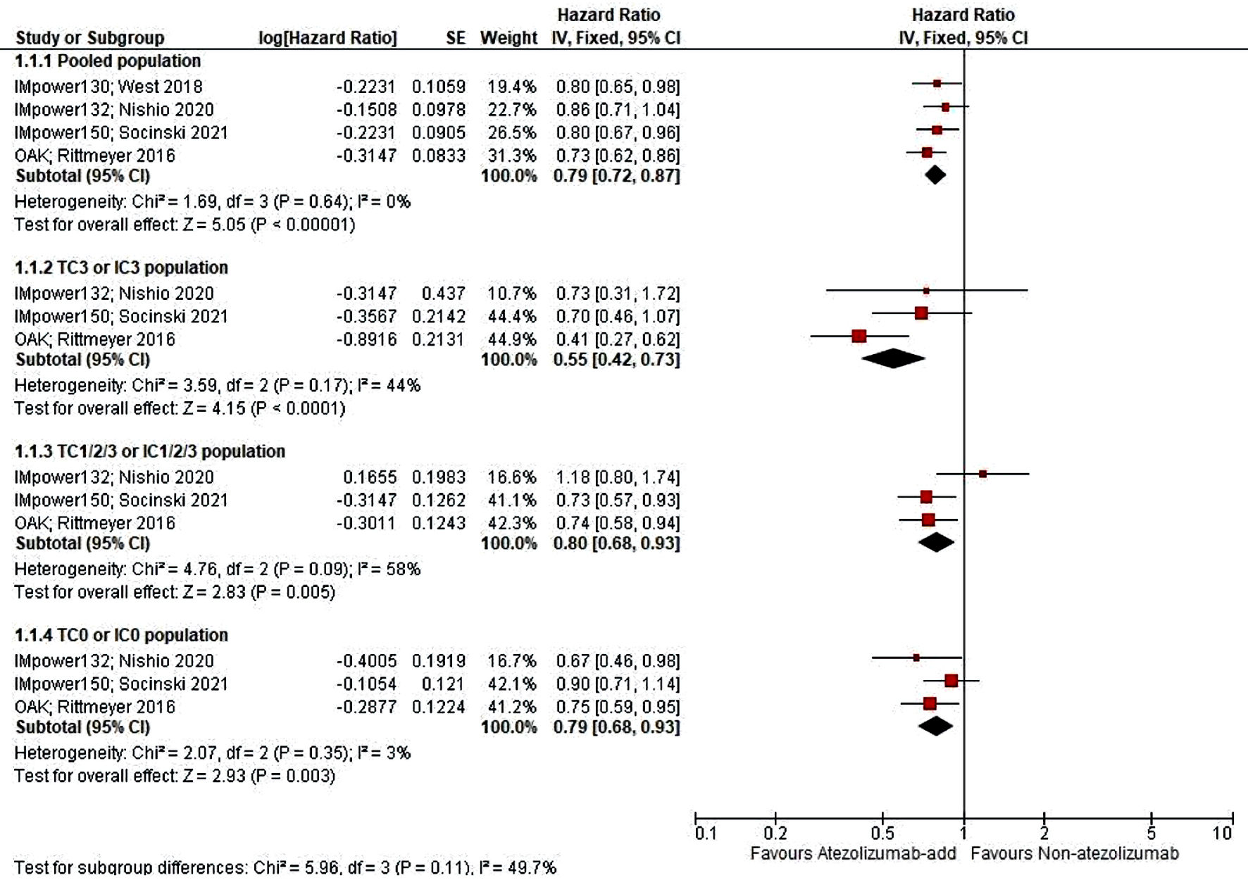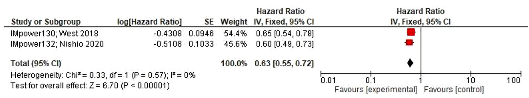 Results: We included four trials to be analyzed in the final analysis, which we stratified into the programmed cell death-ligand 1 (PD-L1) expressivity status aside from the pooled intention-to-treat (ITT) population. We found the addition of atezolizumab may significantly improve the overall survival (OS) in the respective arm, remarkably among the high PD-L1 expression group (TC3 or IC3). The result of our meta-analysis presented the pooled OS of 0.79 (0.72, 0.87) in 95% confidence interval (CI) with a P value of < 0.05. Sub-analysis of the PD-L1’s expression revealed TC3 population benefits the most (hazard ratio (HR): 0.55, 95% CI (0.42, 0.73)), compared to low (HR: 0.80, 95% CI (0.68, 0.93)) and negative expression (HR: 0.79, 95% CI (0.68, 0.93)); which is statistically meaningful (P < 0.05). Similar result was also observed in progression-free survival (PFS) analysis with the HR value of 0.63 (0.55, 0.72), with P value of < 0.05, favoring atezolizumab arm.