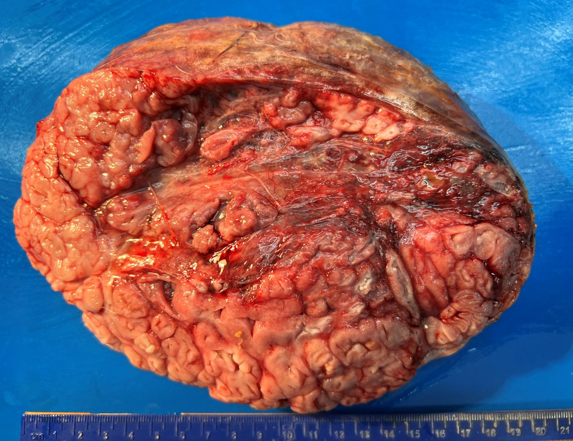 ![]() Click for large image | Figure 2. Macroscopic examination of mastectomy shows multinodular mass with pseudocystical and mucoid aspect and 20 cm of diameter. |