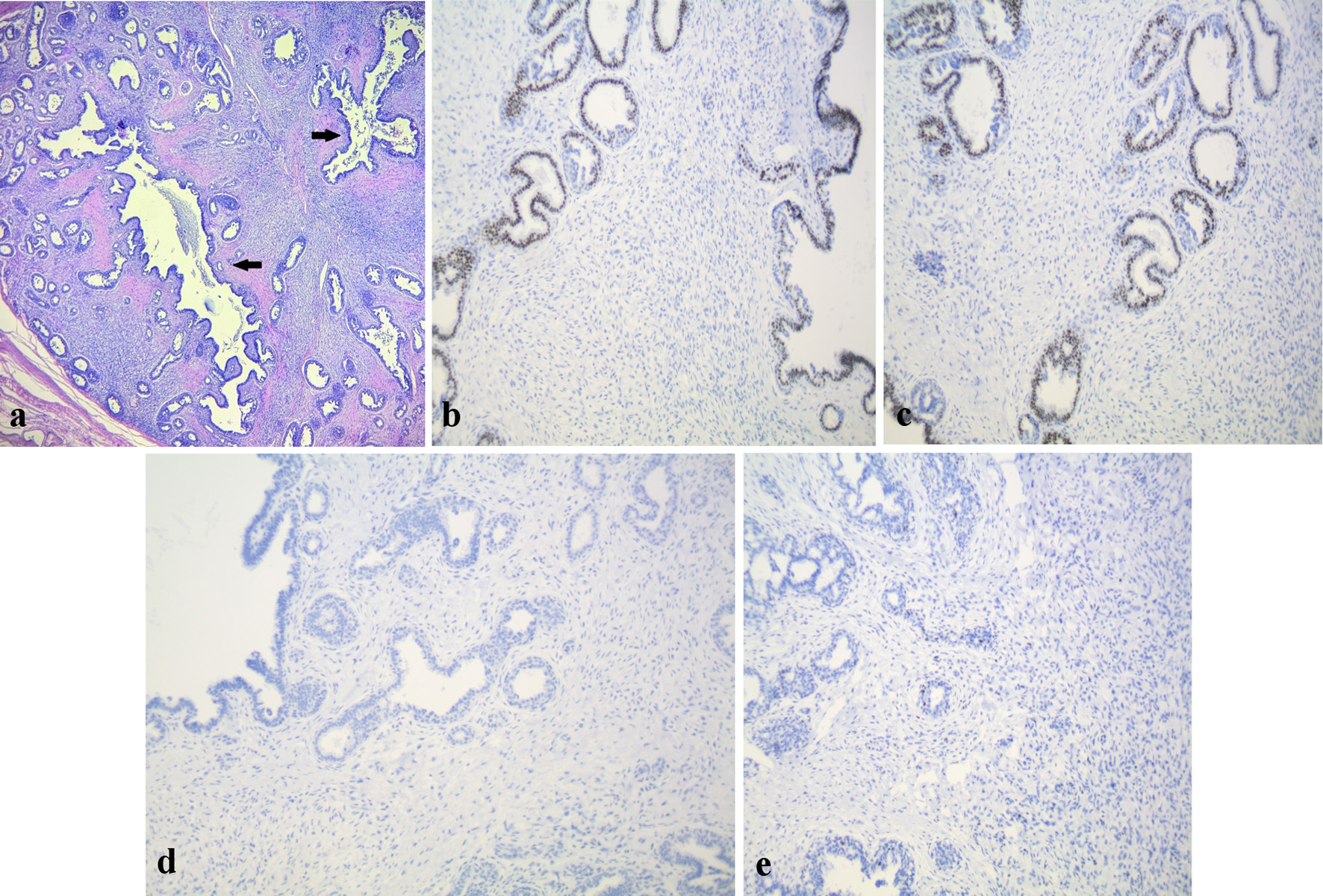 ![]() Click for large image | Figure 3. (a) H&E stain (× 10) shows stroma with nodular enlargement and a leaf-like pattern (arrows). (b) IHC estrogen receptor (× 20) stain shows positive immunoreactivity in 80% of malignant cells. (c) IHC progesterone receptor stain (× 20) shows positive immunoreactivity in 70% of malignant cells. (d) HER2 stain (× 20) shows no immunoreactivity. (e) Ki-67 stain (× 10) shows less than 2% of nuclear immunoreactivity on epithelial cells. IHC: immunohistochemistry; H&E: hematoxylin and eosin; HER: human epidermal growth factor receptor. |